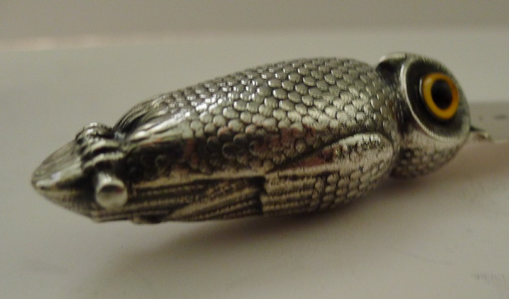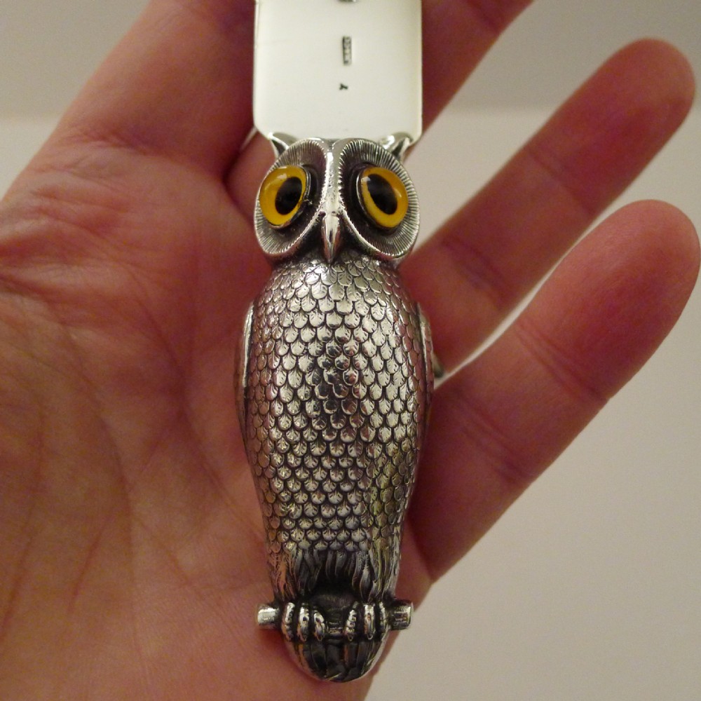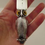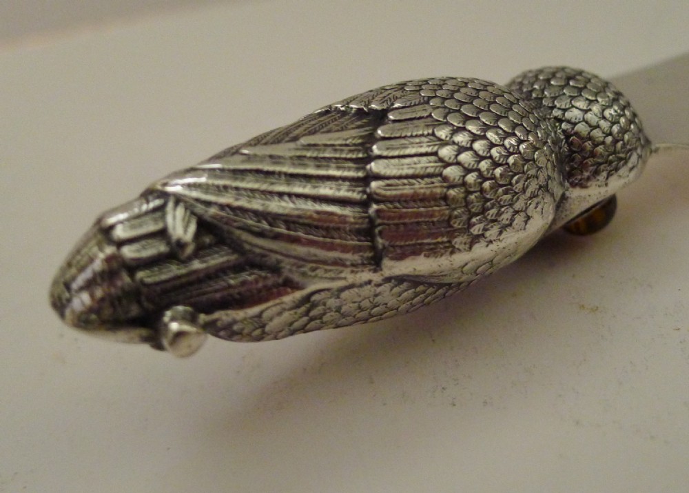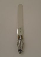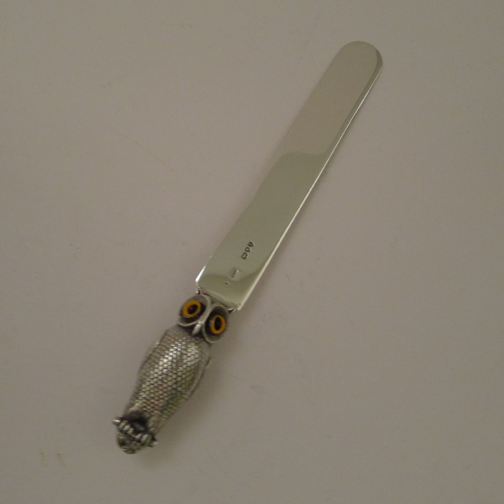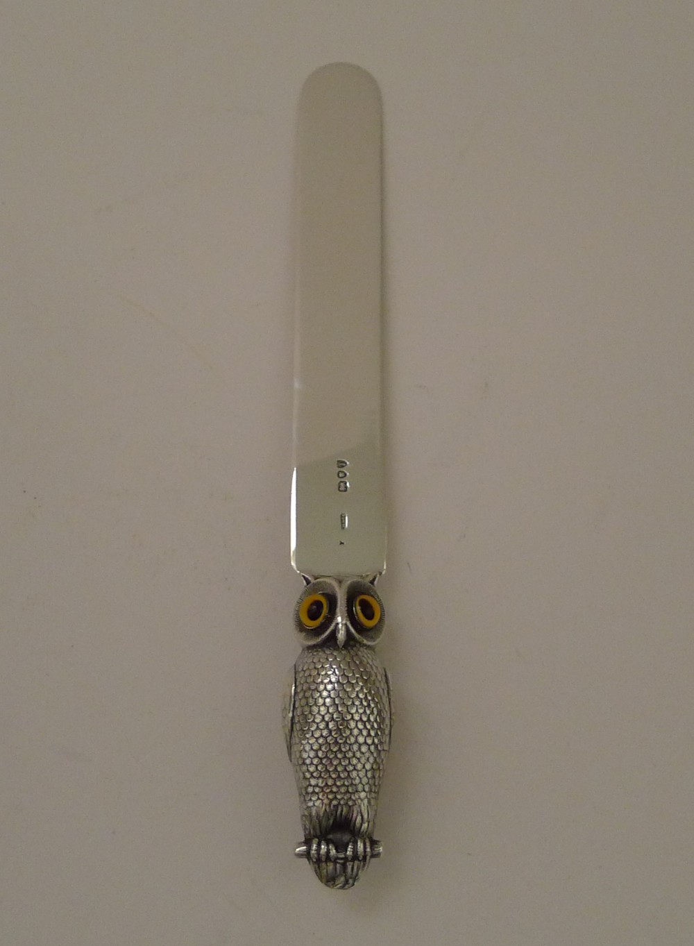 A magnificent and rare piece of Sampson Mordan solid / sterling silver in the form of a paperknife with a novelty handle in the form of an owl with two fabulous original glass eyes.