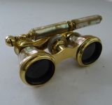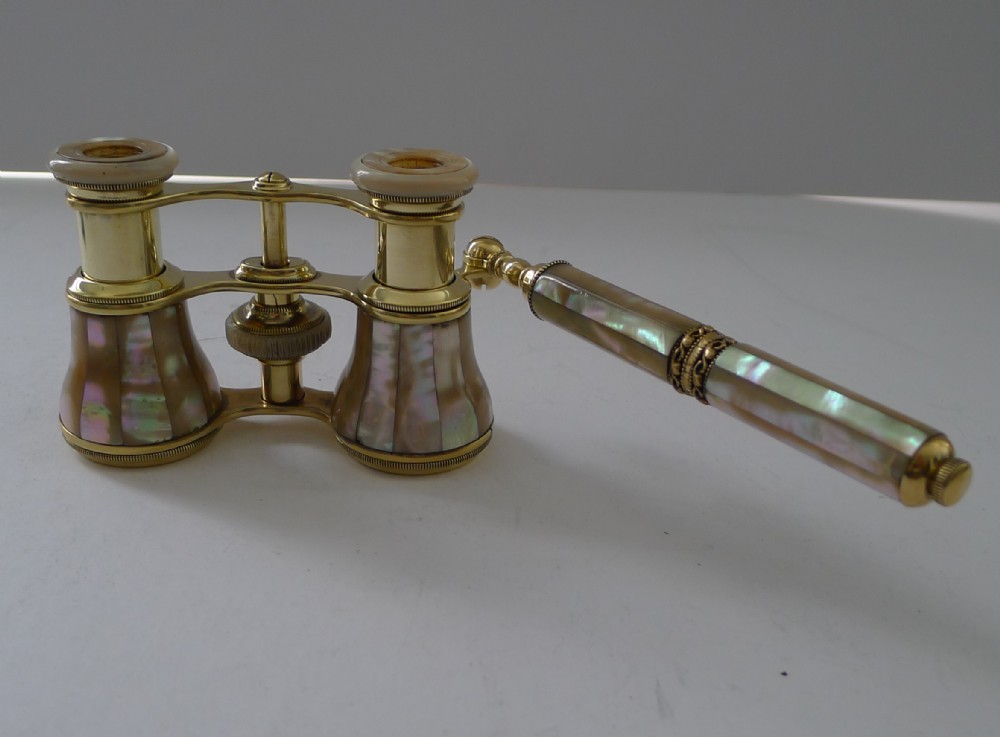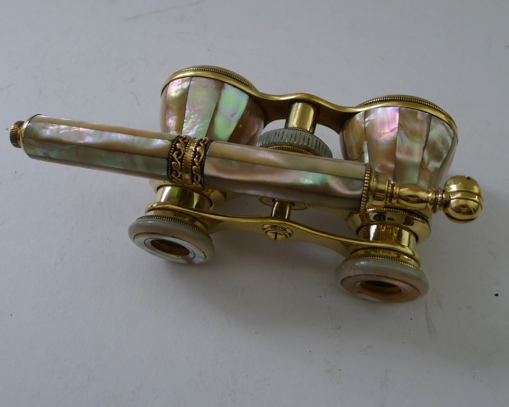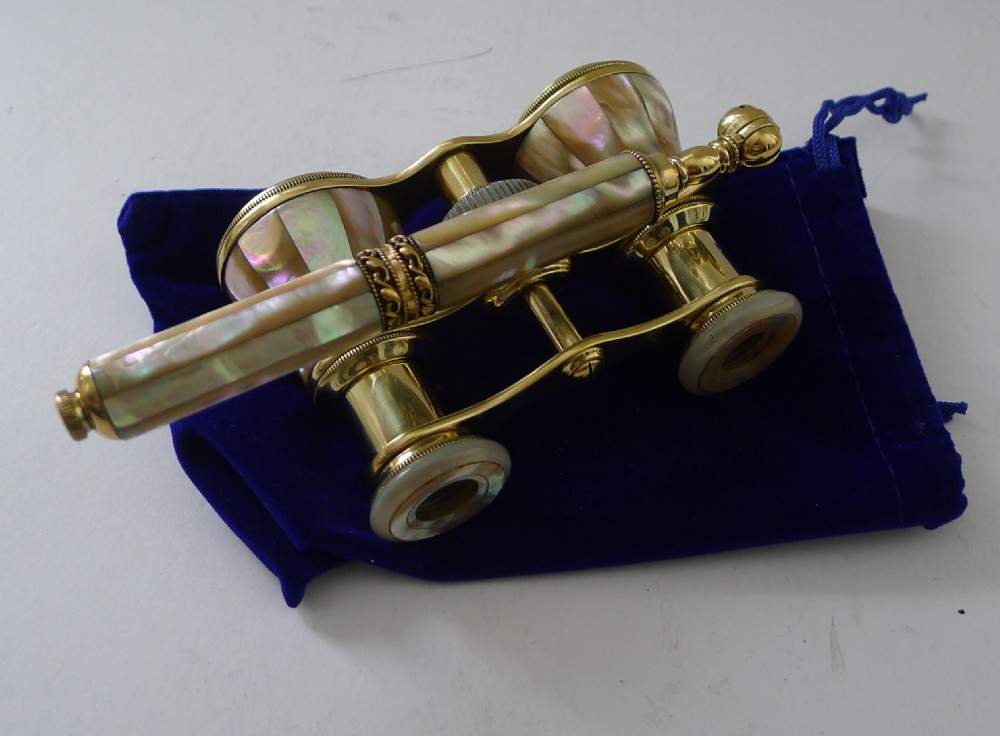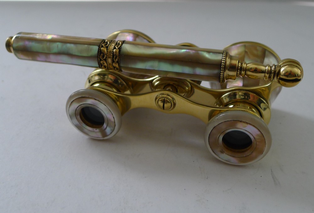 A truly stunning pair of French Opera glasses made from polished brass and clad with Mother of Pearl or Nacre shell. This pair comes with a telescopic lorgnette handle and folds away nicely when not if use. The optics are in excellent working order, ready to enjoy your special night at the Opera or Ballet. Dating to c.1910, they remain in excellent condition and come with a newer velvet pouch. While folded, they measure 5" x 2" x 2". Item: 44563 FREE Worldwide Registered Airmail Directly From the UK FREE Worldwide Shipping Directly From London, England Internal Ref: 44563