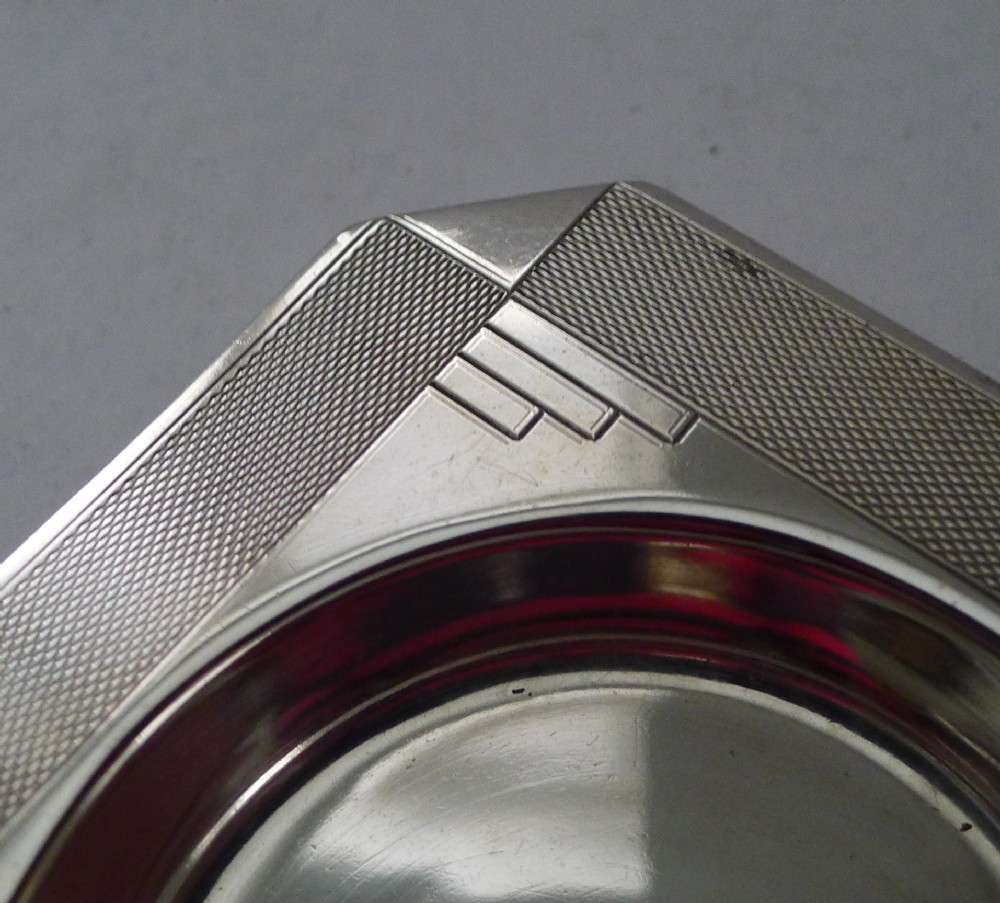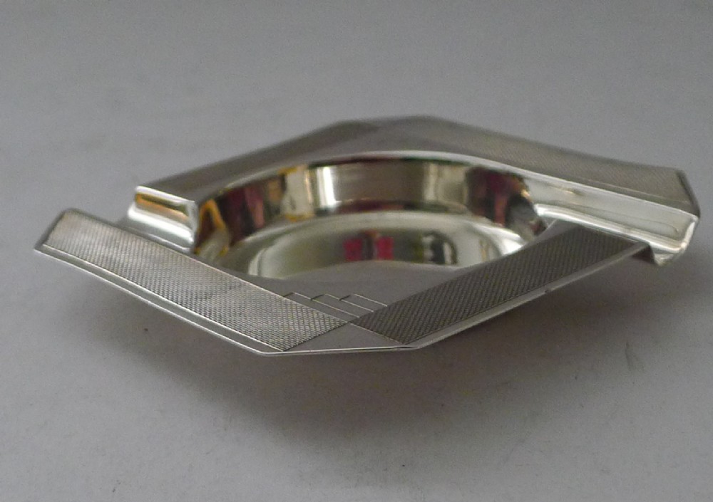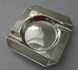 A very smart Art Deco solid silver ashtray, now a true antique example fully hallmarked for Birmingham 1914 together with the makers mark for the well renowned English silversmith, John Grinsell & Sons. Beautiful engine turned decoration and Art Deco motifs. Excellent condition measuring 3 5/8" x 3 5/8" x 1/2". Weighing 58.6 Grams / 1.88 Troy Ounces. Item: 44603 FREE Worldwide Registered Airmail Directly From the UK FREE Worldwide Shipping Directly From London, England Internal Ref: 44603