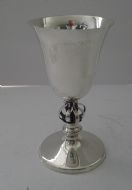 A fabulous and highly collectable solid silver wine goblet by the renowned modern silversmith, Sarah Jones. The goblet is fully hallmarked for London 1983. Excellent vintage condition measuring 5.28" tall x 2.87" wide and weighing 145 Grams / 4.66 Troy Ounces. SARAH JONES studied history of medieval art at the University of East Anglia before working for the Greater London Arts Association. In the early 1970's they sent her to interview the ecclesiastical silversmith Michael Murray for their magazine, and he insisted that she make something, a ring, which she sold for £12. This inspired her to take part time training with him before renting a workshop next door in Clerkenwell. Camden Lock Market opened in 1974 and she had a stall there for 8 years, and also exhibited at Goldsmiths' Fair in 1975. In 1979 the Queen, who has the world's largest collection of Faberge flowers, visited Goldsmiths' Hall and Sarah was commissioned to make a presentation piece featuring a rose, thistle, daffodil and shamrock. She opened a shop in the City in 1980 next to the Guildhall and was so successful, employing up to 8 craftsmen, that she opened another shop in Piccadilly in 1986. Both shops were closed by 2000. She has had many major commissions from Livery Companies and for the late Queen Elizabeth II and the Queen Mother. Item: 44602 FREE Worldwide Registered Airmail Directly From the UK FREE Worldwide Shipping Directly From London, England Internal Ref: 44602