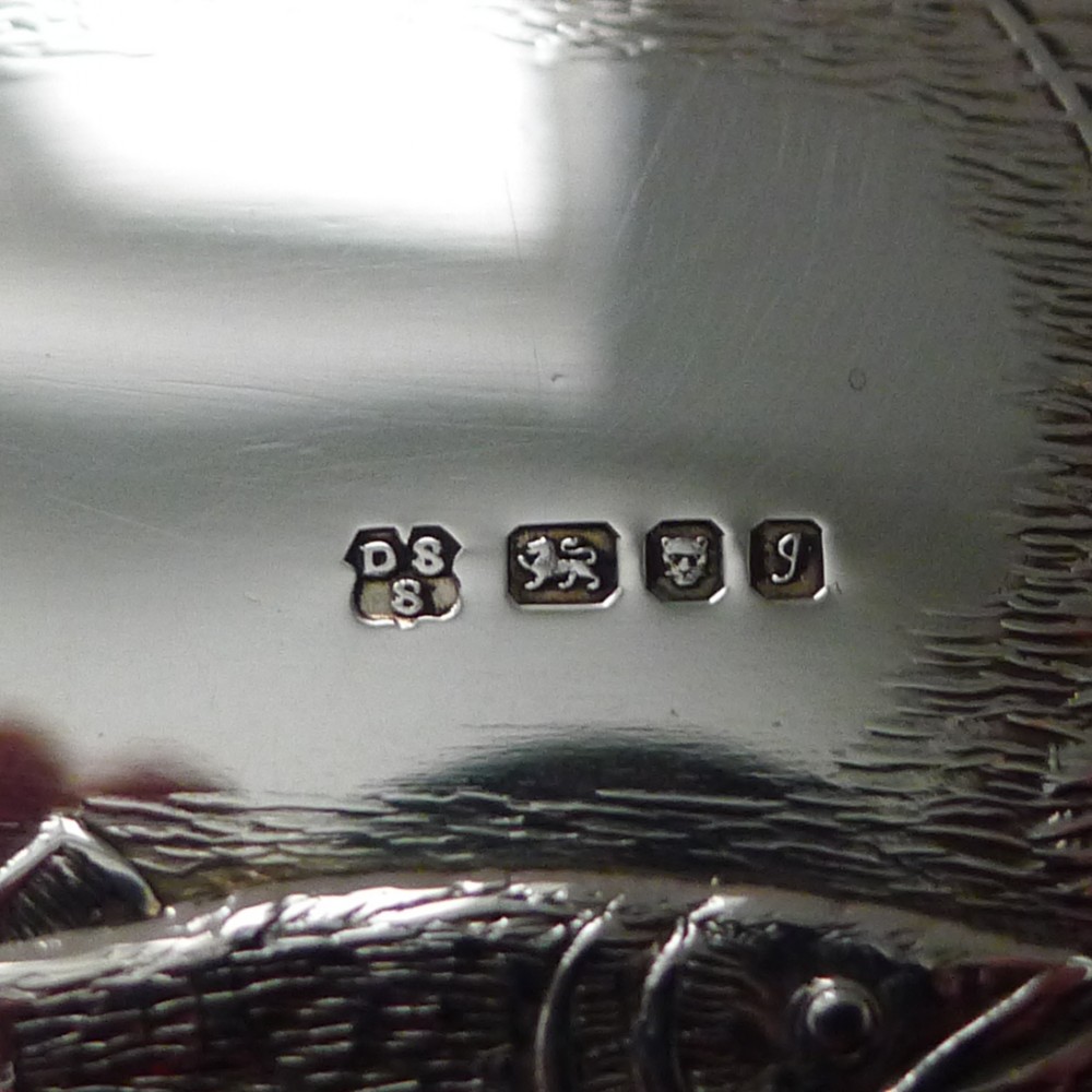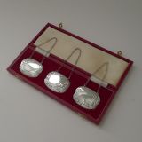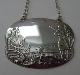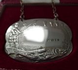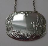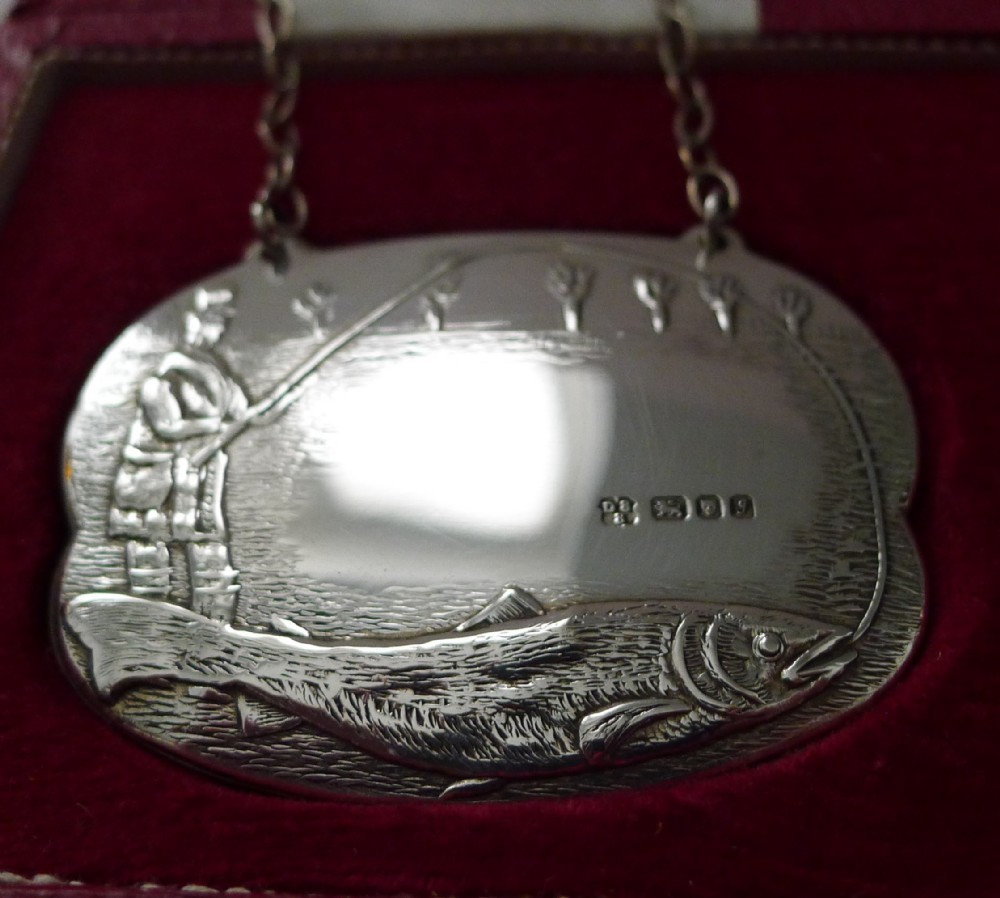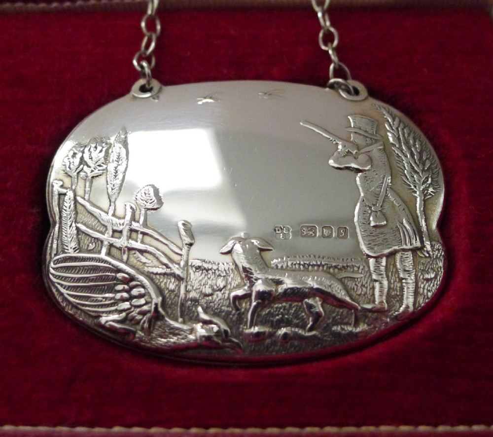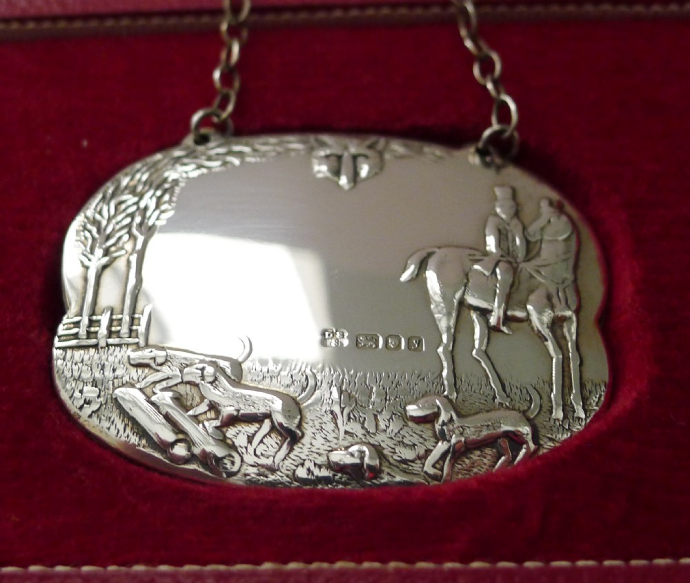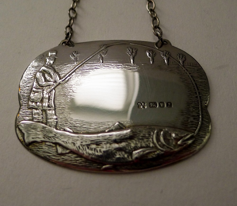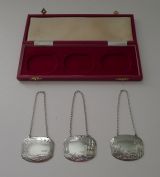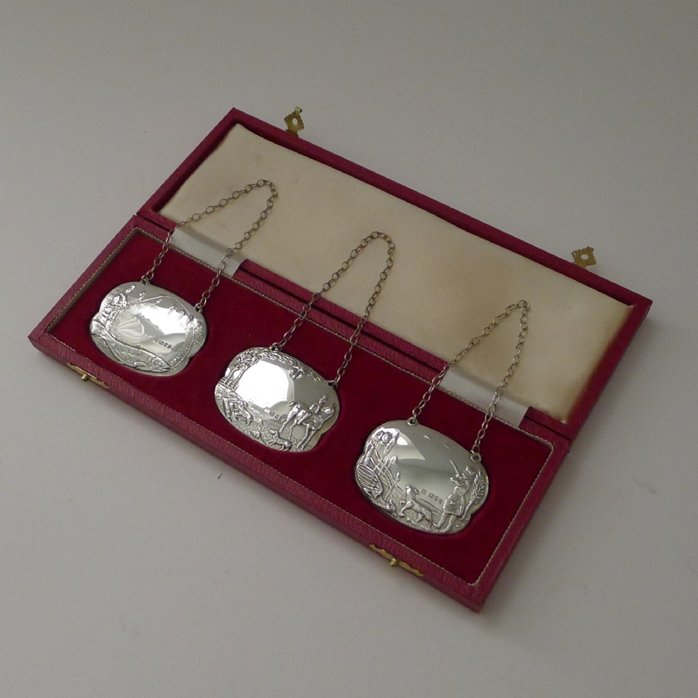 A wonderful and most unusual set of three English solid / sterling silver decanter / Liquor labels each fully hallmarked for London 1983 together with the makers mark for David Shaw Silverware Ltd. Each of the labels is different with one featuring an angler with a large Salmon below; one with fox hunting scene and the third with a game hunter with gun dogs. All three are in wonderful unused condition without any engravings. Each label (excluding the chain) measures 2.2 inches x 1.57 inches; all three sit in their original presentation case. Item: 45963 FREE Worldwide Registered Airmail Directly From the UK FREE Worldwide Shipping Directly From London, England Internal Ref: 45963