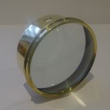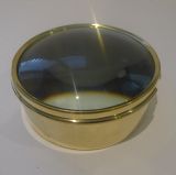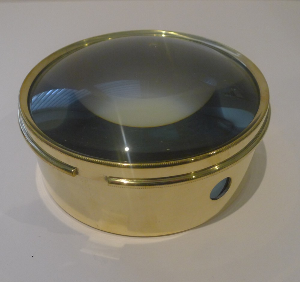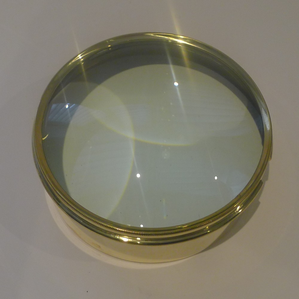 Always very popular and a very useful desk-top accessory, this one is larger than the average size, quite an imposing size. These large circular magnifiers actually are the condenser or magnifier from a Magic Lantern dating to around 1910; they are rescued, polished up and put back to use in the modern day. This one is made from polished brass and is excellent quality, un-marked but probably by Optimus. The top of the glass is domed, always more sought-after than the flat lenses. Wonderful condition, with a good magnification and a hefty piece to keep those papers in place. 6 1/4" in diameter x 2 1/2" high. Item: 44466 FREE Worldwide Registered Airmail Directly From the UK FREE Worldwide Shipping Directly From London, England Internal Ref: 44466