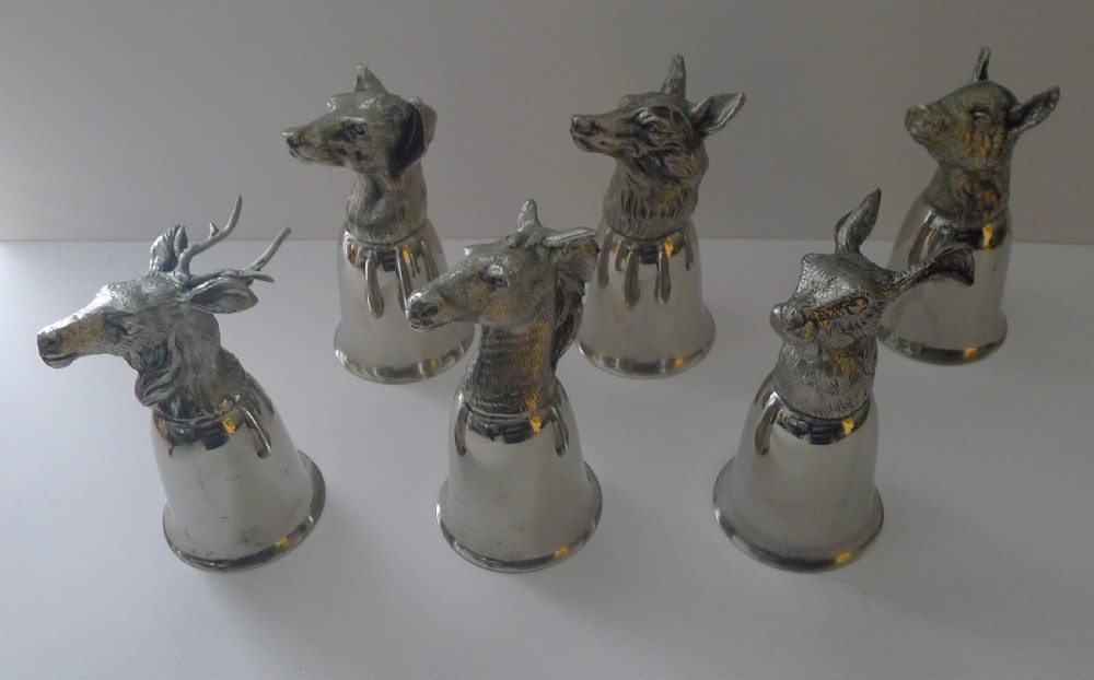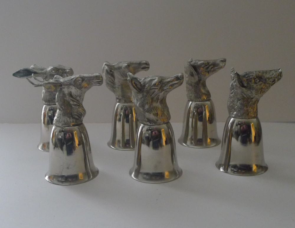 A stunning set six figural hunting stirrup cups in silver plate, made by the iconic Italian designer, Mauro Manetti. The six cups are in the form of animal heads: Fox, Horse, Stag, Dog, Boar and Hare Each is signed M/M and "Italy". The set was rather dull so they have just returned from my silversmith's workshop where they have been professionally cleaned, re-plated and polished, restoring them to their former glory. Dating to c.1970, they all remain in very good condition with minor wear commensurate with age and use; measuring approximately 3 3/4" x 3" x 5 3/4" tall (Hare). Item: 45966 FREE Worldwide Registered Airmail Directly From the UK FREE Worldwide Shipping Directly From London, England Internal Ref: 45966