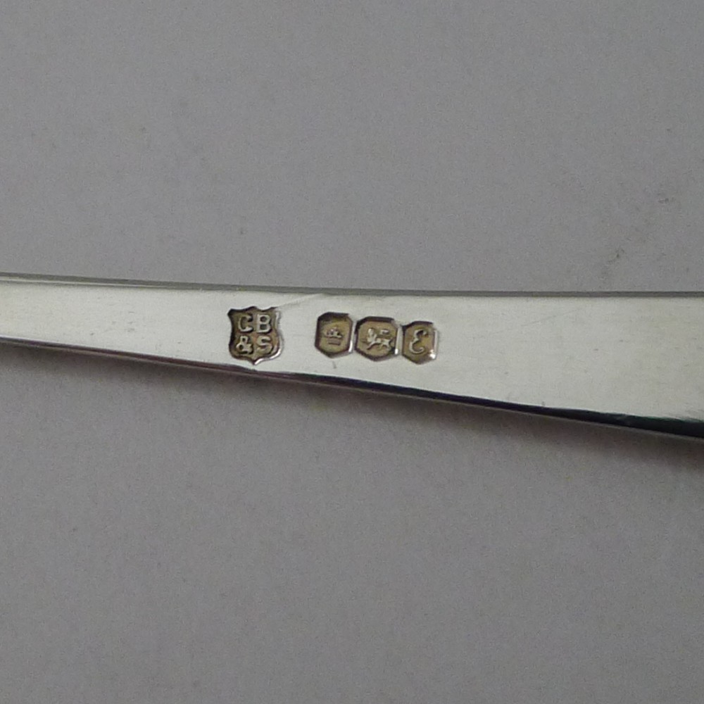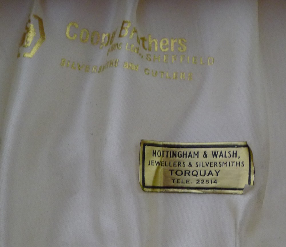 Each is marked with the makers mark for Cooper Brothers and Sons Ltd. of Sheffield. The set sits in the original presentation box signed on the lid interior for Cooper Brothers and also a sticker for the retailer.