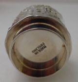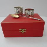 Superb condition without any inscriptions with the egg cup measuring 1 1/2" in diameter x 1 3/8" tall; the napkin ring measuring 1 1/2" in diameter x 1" and the spoon measuring 4 3/4" in length. The box measures 6" x 4 1/2" x 2 1/2".