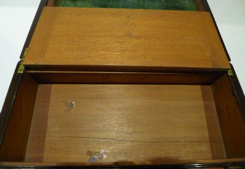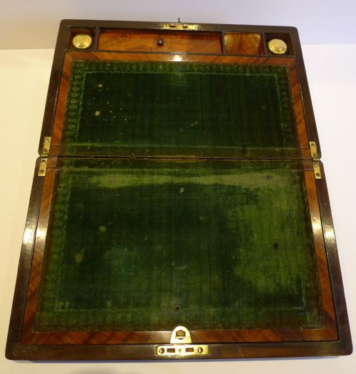 The interior reveals the intact original embossed velvet writing surface surrounded by Walnut cross-banding. Each of the writing slopes opens to reveal storage below, there is a shrinkage hairline to the secondary wood or the base of the box, quite normal for these boxes and mentioned and shown purely for accuracy.