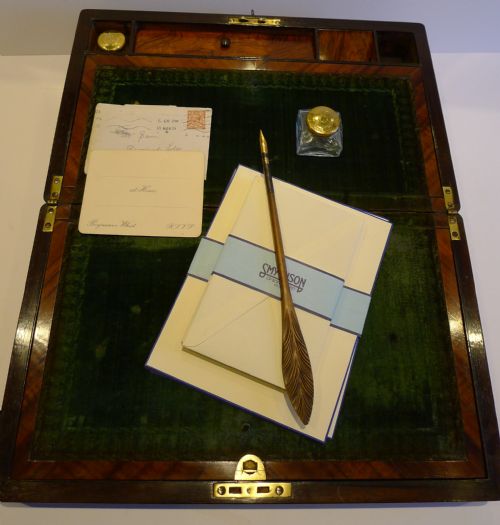 A stunning William IV (c.1830) writing box with exceptionally fine and intricate Mother of Pearl inlay, all intact, framed with thick pewter stringing, typical of this era.