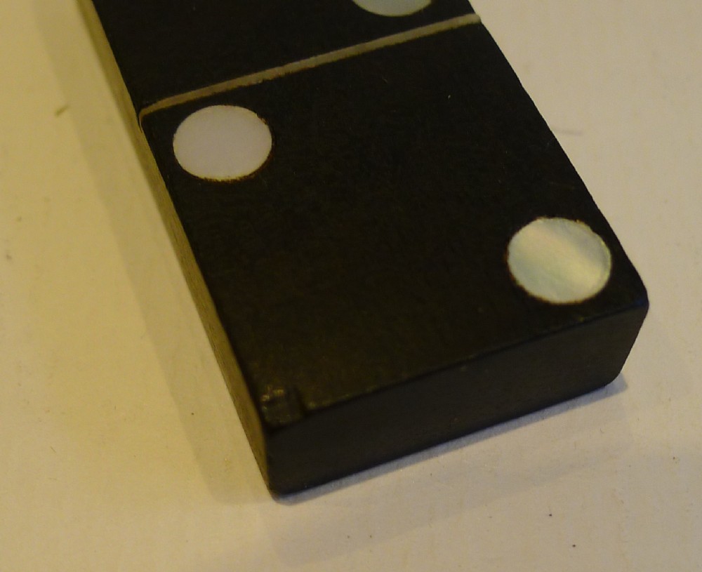 Dating to around 1900, it is very, very unusual to come across a set of late Victorian Dominoes made with this combination of materials. Each tile is made from solid Ebony, the spots all created from Mother of Pearl or Nacre shell. Each side of the domino is separated with an inlaid pewter stringing.