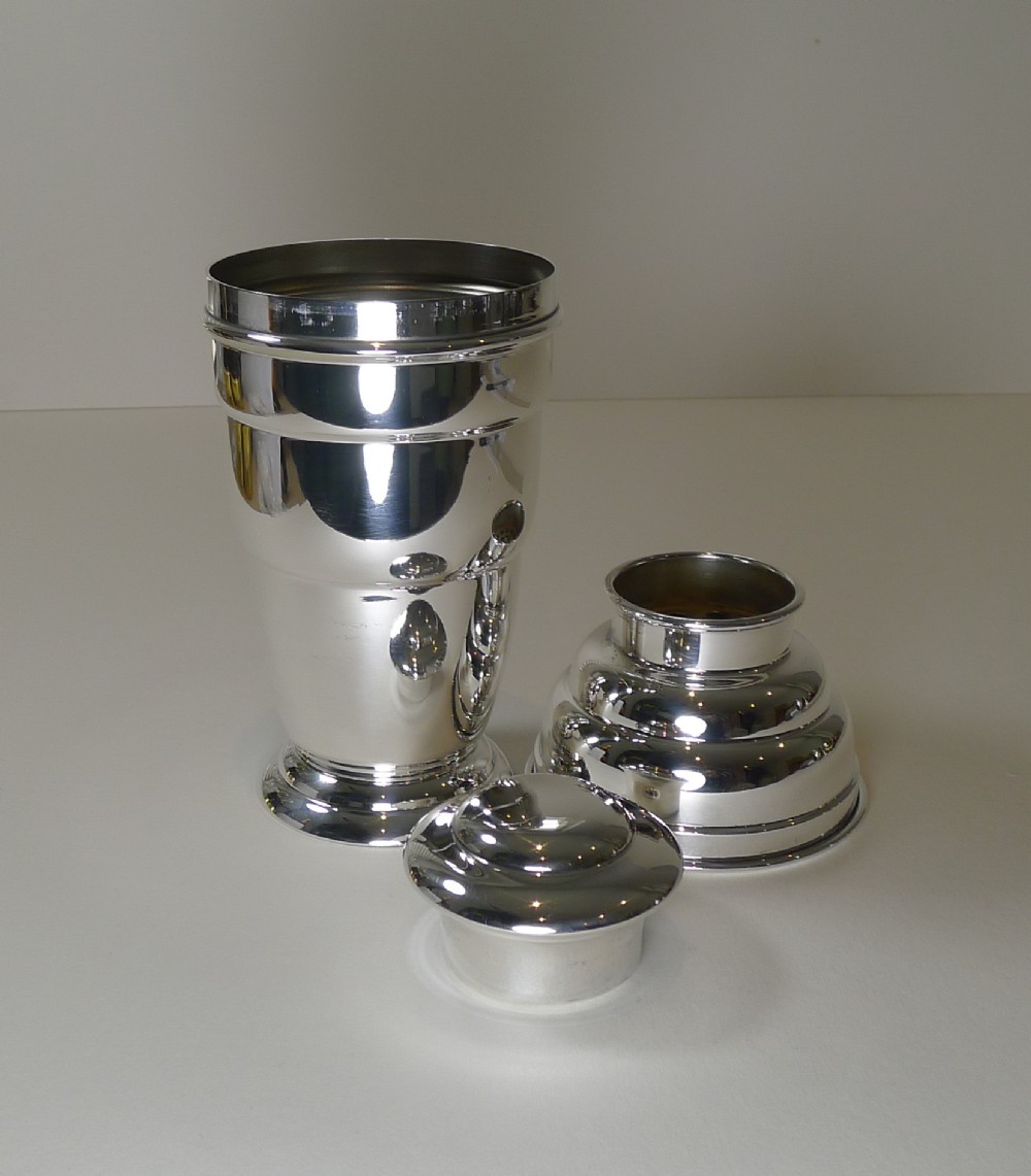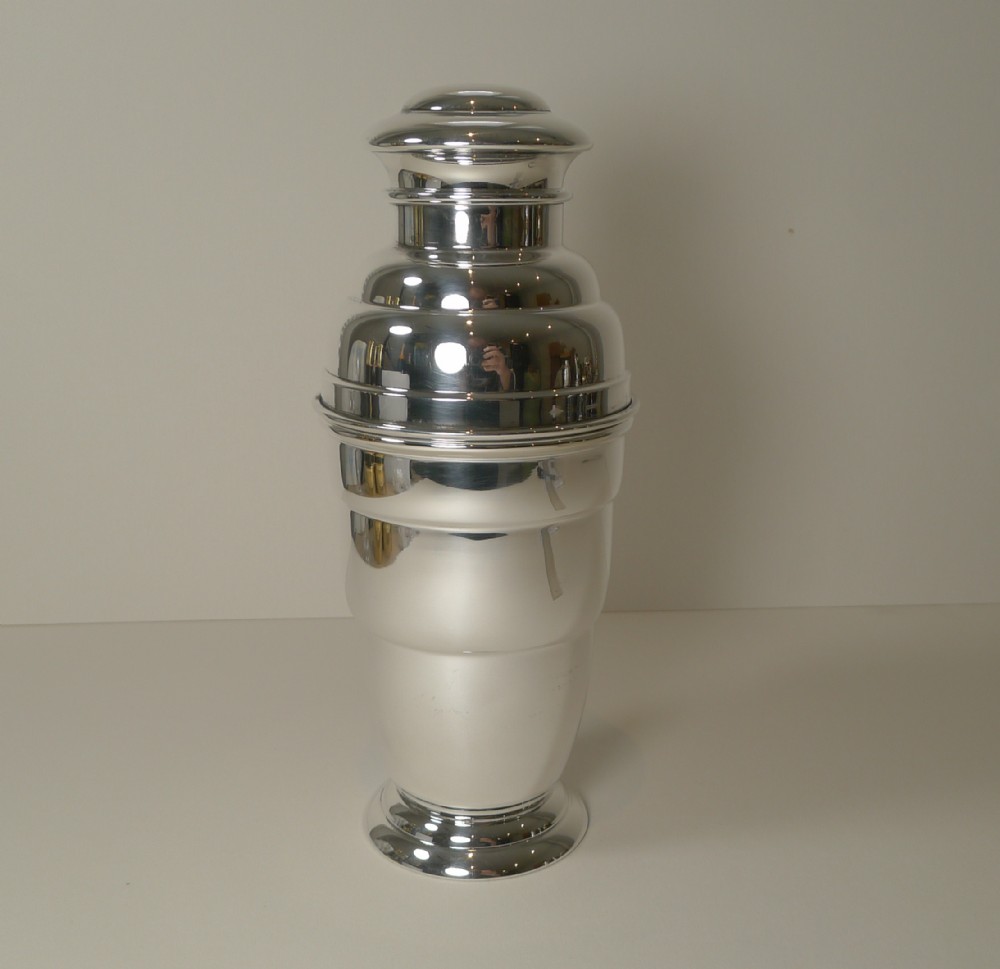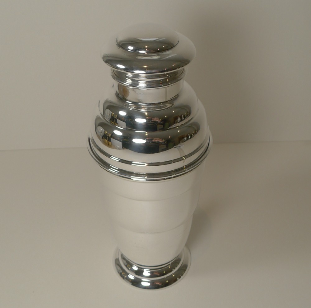A truly fabulous English Art Deco silver plated cocktail shaker, beautifully shaped and in lovely condition having just returned from our silversmith's workshop where it has been professionally cleaned and polished, restoring it to it's former glory.