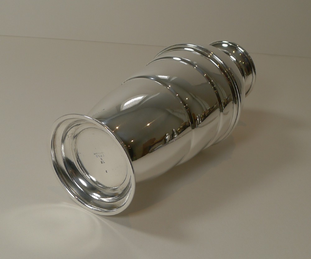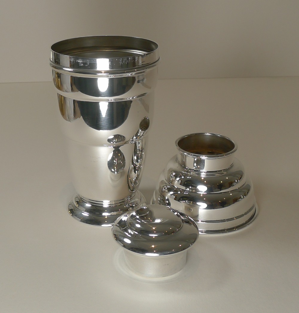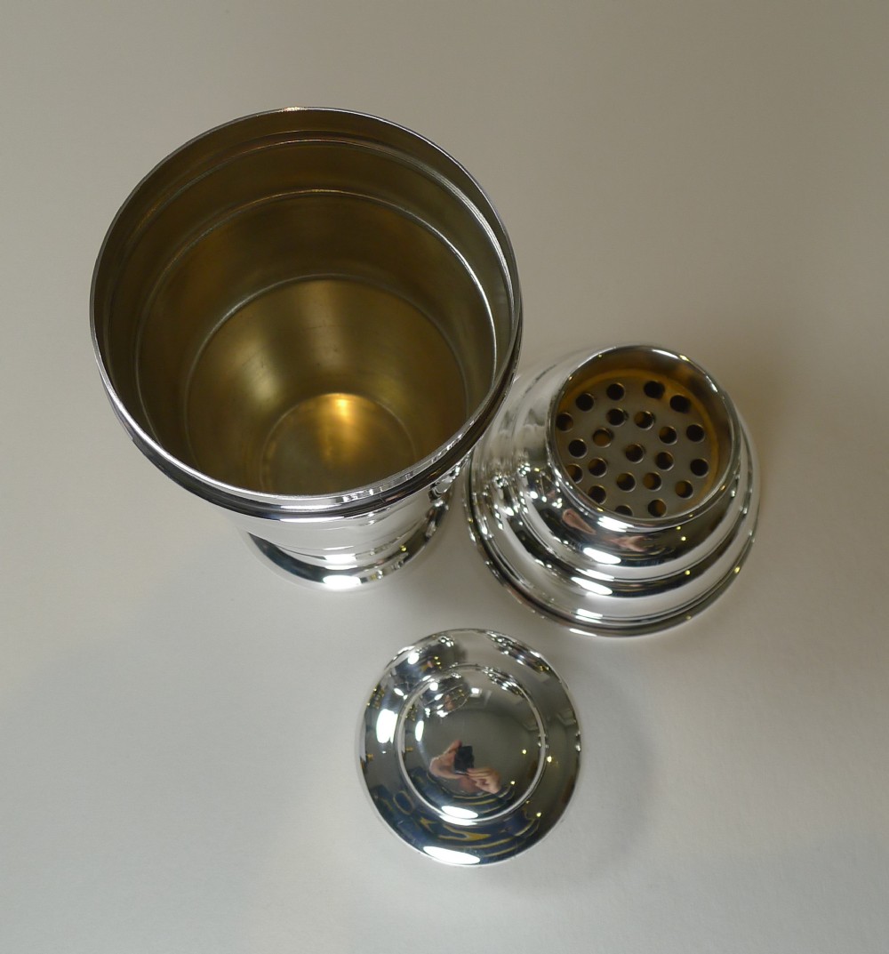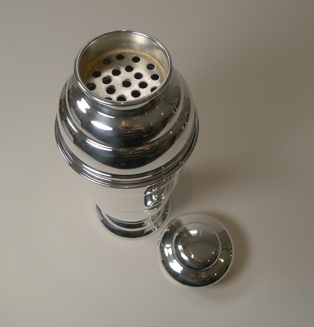 A truly fabulous English Art Deco silver plated cocktail shaker, beautifully shaped and in lovely condition having just returned from our silversmith's workshop where it has been professionally cleaned and polished, restoring it to it's former glory.