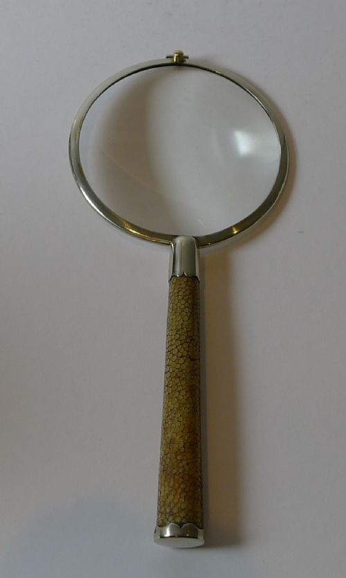 A handsome and most unusual magnifying glass in a winning and highly sought-after combination of English silver plate and Shagreen. The ferrule frame and terminal are all silver plated, Art Deco in era c.1930. The glass lens is the original with a good usable magnification, there is a natural slight wobble when used due to the traditional pinned construction rather than glued, as it should be and mentioned purely for accuracy. A real gem in excellent condition measuring 8 1/8" in length x 3 5/8" wide x 3/4" thick. Item: 44289 FREE Worldwide Registered Airmail Directly From the UK FREE Worldwide Shipping Directly From London, England Internal Ref: 44289