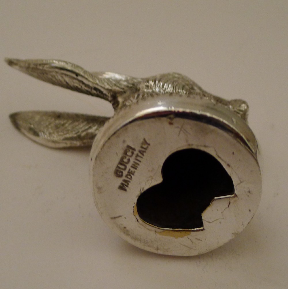 A fabulous and highly collectable bottle opener by the iconic Italian designer, Gucci. Made from silver plate, this example is in the form of a Hare, one of the most desirable examples made by Gucci. Dating to the 1970's it remains in superb condition with wear to the underside commensurate with age and use. Signed Gucci, Italy. 3 1/2" x 2" x 2 1/2" Item: 44300 FREE Worldwide Registered Airmail Directly From the UK FREE Worldwide Shipping Directly From London, England Internal Ref: 44300