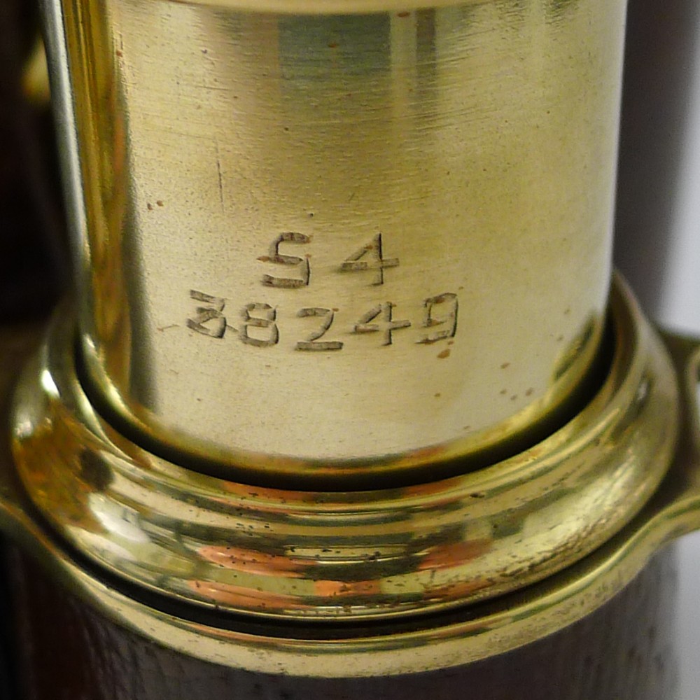The brass has been meticulously professionally polished, a winning combination with the leather. The brass is engraved with the military crows foot mark together with S4 and 38249