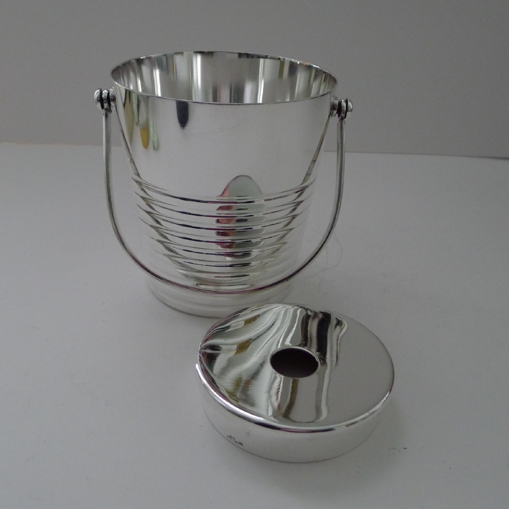 A stylish vintage French ice bucket or pail in silver plate, designed by Luc Lanel in 1932 for Maison Christofle of Paris. It's simple Art Deco design with ribbed decoration around the body and ribbed swing handle is as fashionable in 2021 than it was in the 1930's. The pattern , called “Ondulations” was originally designed for the First Class Dining Room and Bar of the ocean liner, the S.S. Normandie . This grand ship was the ultimate in art deco interiors . Fully marked on the underside, it has been professionally cleaned and polished by our silversmith and remains in superb condition complete with it's original draining frog. The rim diameter measures 5" standing 5 1/4" tall. Item: 40152 FREE Worldwide Registered Airmail Directly From the UK FREE Worldwide Shipping Directly From London, England Internal Ref: 40152