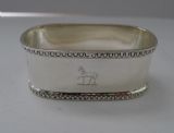 A stunning pair of cased napkin rings made from solid English sterling silver, beautifully cast with an egg and dart border to top and bottom. Each is engraved with a handsome horse monogram, perfect for the equestrian devotee. They are hallmarked for London 1925, 100 years old and a true antique pair. They sit in their very smart original leather case, lined in velvet and cream silk, the interior of the lid printed "Asprey, 166 Bond St, London" Excellent condition with 41.6 Grams / 1.34 Troy Ounces combined weight. Dimensions approximately Length : 5.3 cm or 2.1”inch Height : 2.0 cm or 0.78” Inch Width : 2.9 cm or 1.20” Inch Fitted Box : Length 15.5 x Width 7.0 cm x Height 4.0 cm Item: 44597 FREE Worldwide Registered Airmail Directly Form the UK FREE Worldwide Shipping Directly From London, England Internal Ref: 44597
