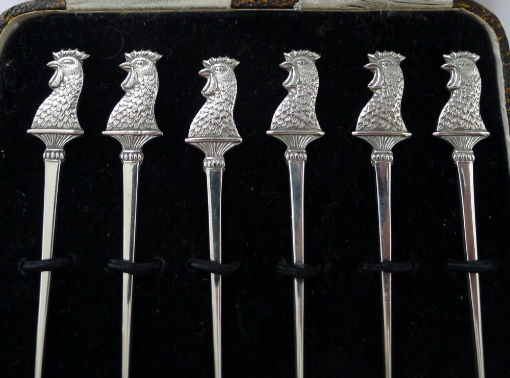 A fabulous and unusual set of six solid silver cocktail sticks, each featuring a Cockerel terminal and hallmarked on the underside for Sheffield 1928 together with the makers mark for James Dixon and Sons. They sit within their original presentation case in good condition. A lovely handsome set in excellent condition, each stick measuring 3.19 inches / 8.1 cms in length. The case measuring 4 1/2" x 4 1/2" x 1" Item: 44954 FREE Worldwide Registered Airmail Directly From the UK FREE Worldwide Shipping Directly From London, England Internal Ref: 44954