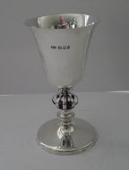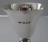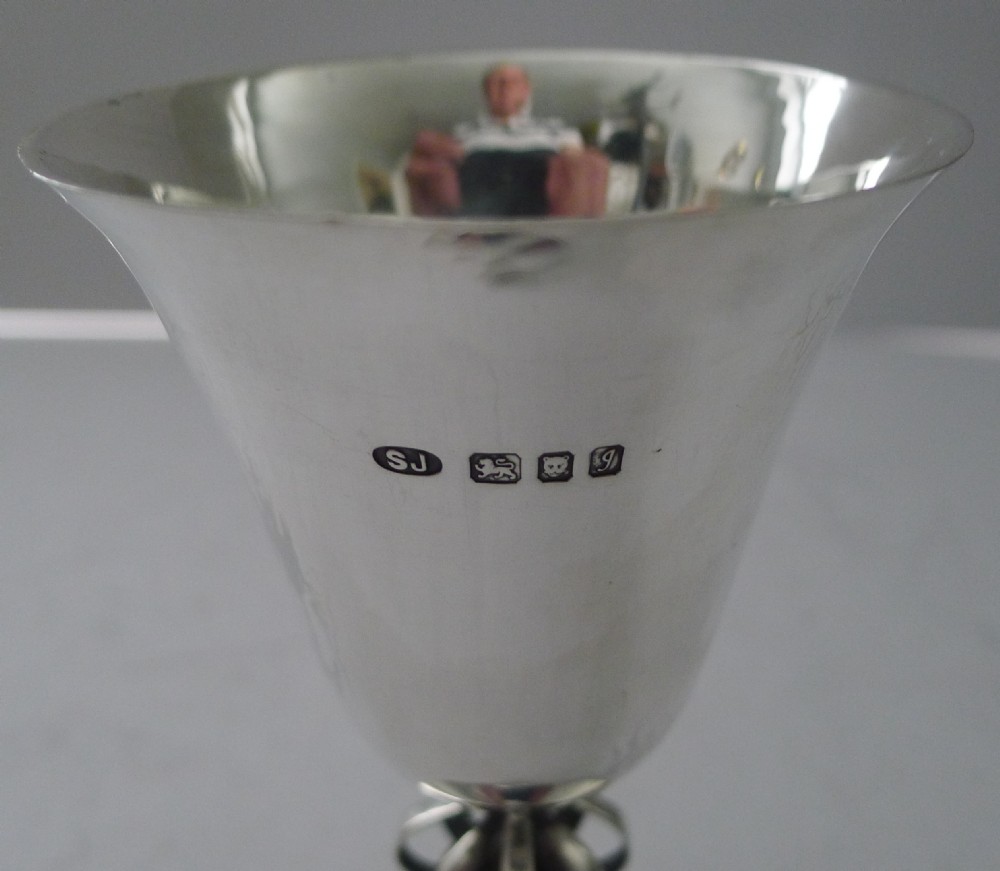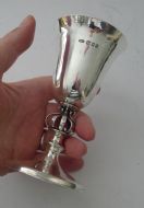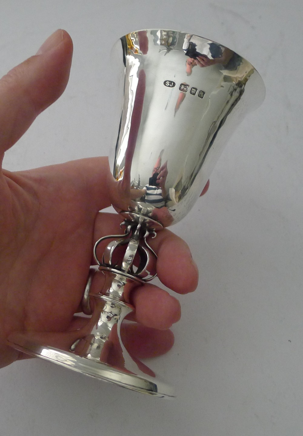 A fabulous and highly collectable solid silver wine goblet by the renowned modern silversmith, Sarah Jones. The goblet is fully hallmarked for London 1983. Excellent vintage condition measuring 5.28" tall x 2.87" wide and weighing 145 Grams / 4.66 Troy Ounces. SARAH JONES studied history of medieval art at the University of East Anglia before working for the Greater London Arts Association. In the early 1970's they sent her to interview the ecclesiastical silversmith Michael Murray for their magazine, and he insisted that she make something, a ring, which she sold for £12. This inspired her to take part time training with him before renting a workshop next door in Clerkenwell. Camden Lock Market opened in 1974 and she had a stall there for 8 years, and also exhibited at Goldsmiths' Fair in 1975. In 1979 the Queen, who has the world's largest collection of Faberge flowers, visited Goldsmiths' Hall and Sarah was commissioned to make a presentation piece featuring a rose, thistle, daffodil and shamrock. She opened a shop in the City in 1980 next to the Guildhall and was so successful, employing up to 8 craftsmen, that she opened another shop in Piccadilly in 1986. Both shops were closed by 2000. She has had many major commissions from Livery Companies and for the late Queen Elizabeth II and the Queen Mother. Item: 44602 FREE Worldwide Registered Airmail Directly From the UK FREE Worldwide Shipping Directly From London, England Internal Ref: 44602