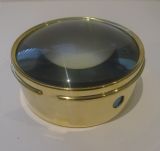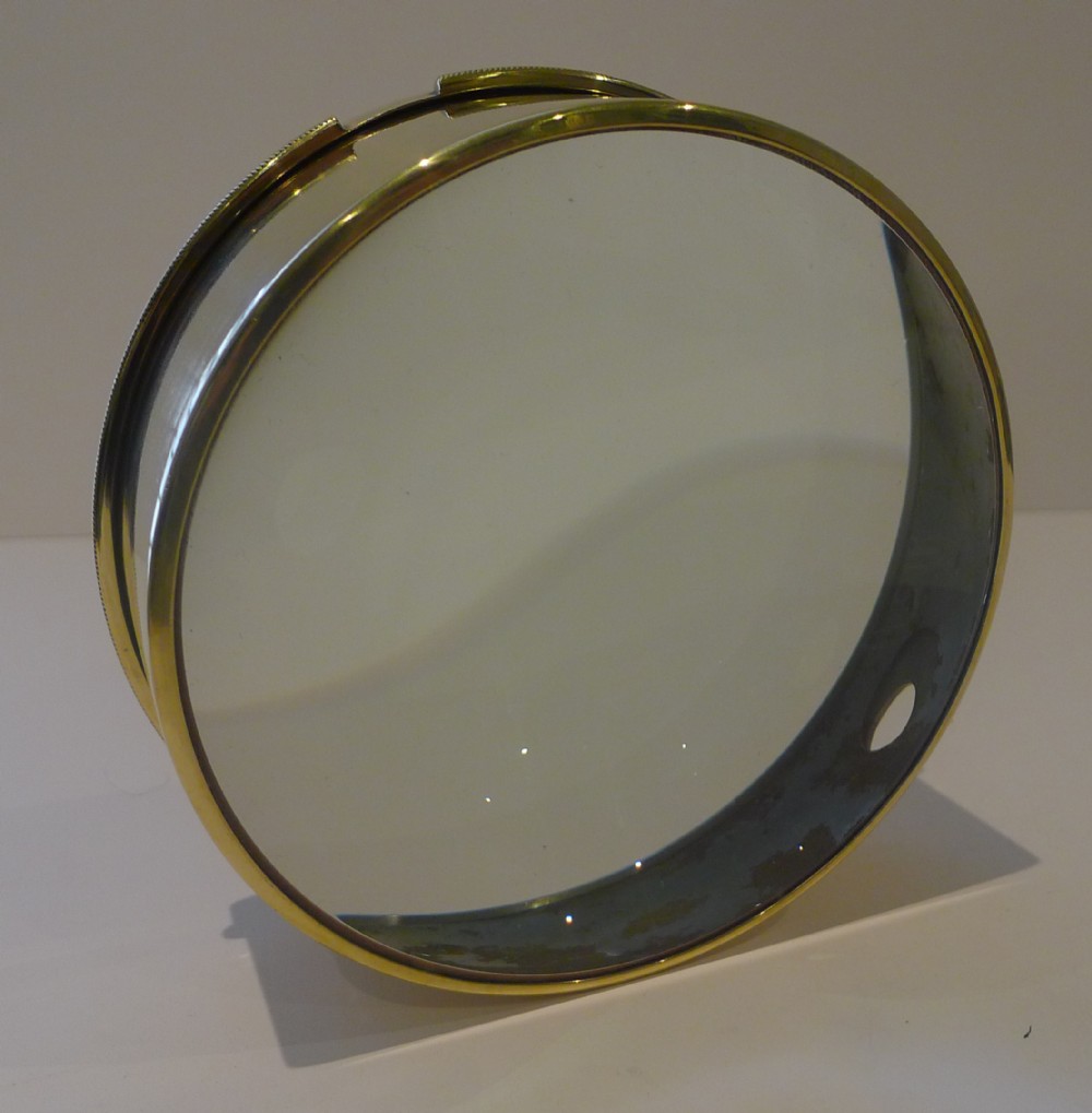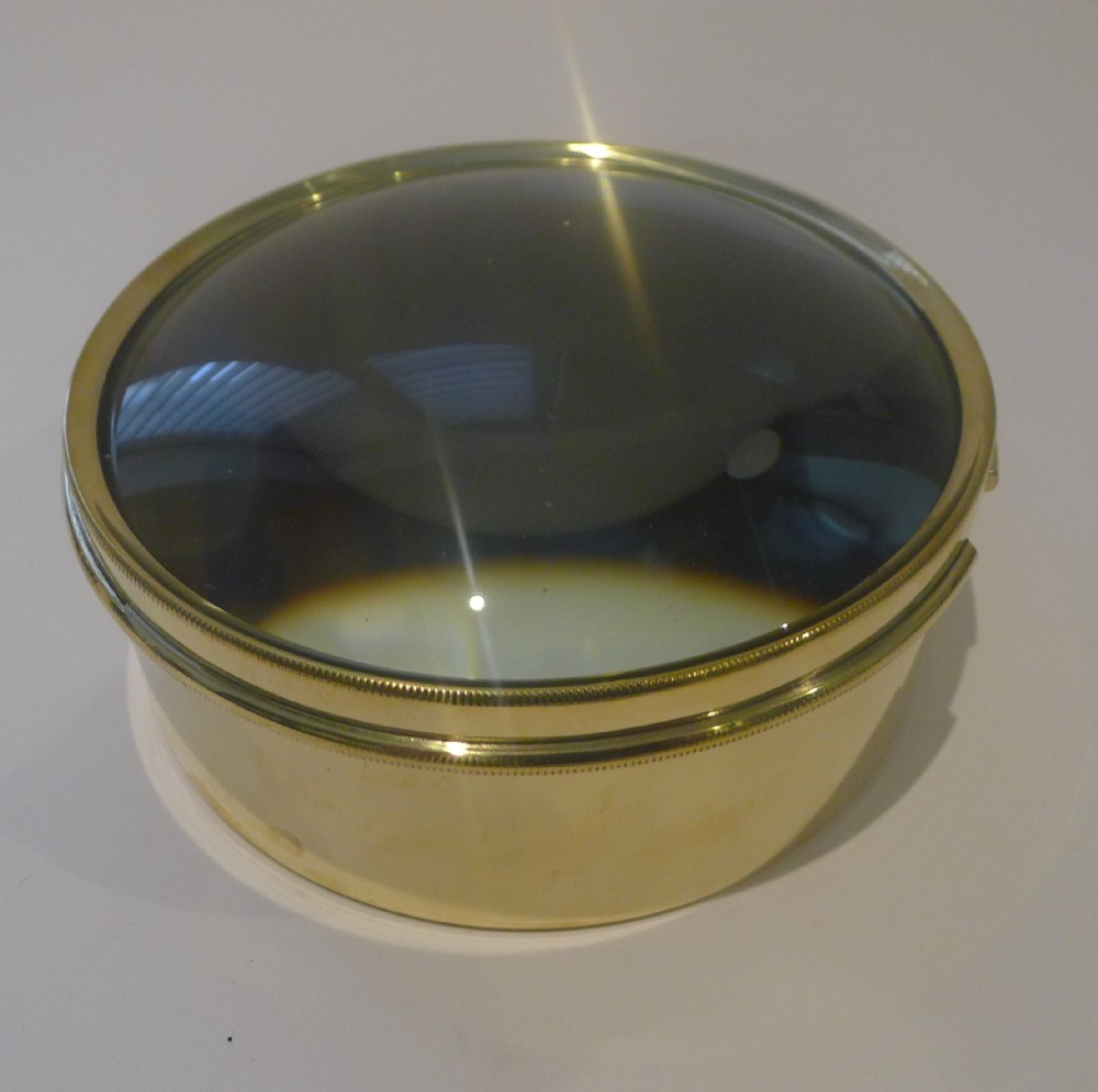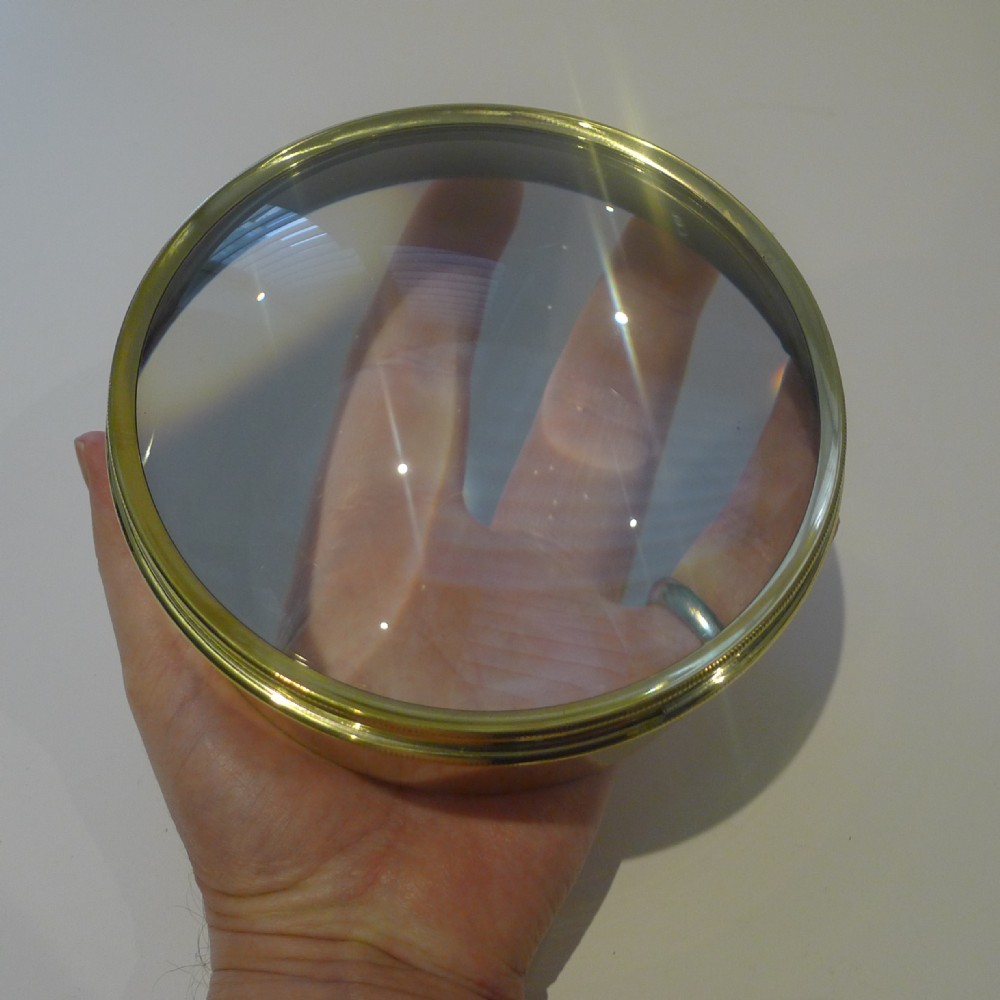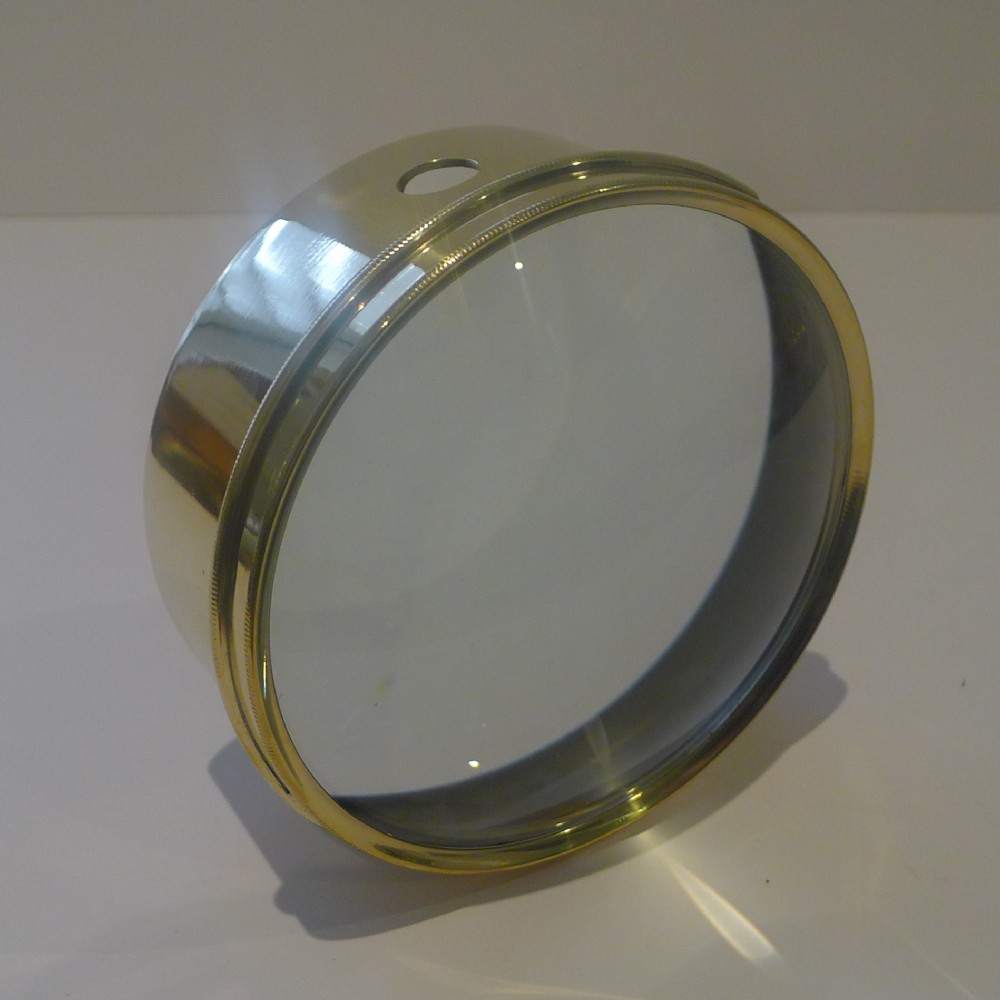 Always very popular and a very useful desk-top accessory, this one is larger than the average size, quite an imposing size. These large circular magnifiers actually are the condenser or magnifier from a Magic Lantern dating to around 1910; they are rescued, polished up and put back to use in the modern day. This one is made from polished brass and is excellent quality, un-marked but probably by Optimus. The top of the glass is domed, always more sought-after than the flat lenses. Wonderful condition, with a good magnification and a hefty piece to keep those papers in place. 6 1/4" in diameter x 2 1/2" high. Item: 44466 FREE Worldwide Registered Airmail Directly From the UK FREE Worldwide Shipping Directly From London, England Internal Ref: 44466