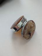 A spectacular example of a solid silver snuff box inset with two agate stone panels to top and bottom, both in beautiful undamaged condition with a bright polished patina. The box has a hinged lid in full working order and the lid "clicks" closed in full working order. The silver is fully hallmarked for Birmingham 1902, together with the makers mark for Hilliard & Thomason. Measuring 2 1/4" wide x 1" and remains in superb condition. Item: 45969 FREE Worldwide Registered Airmail Directly From the UK FREE Worldwide Shipping Directly From London, England Internal Ref: 45969