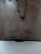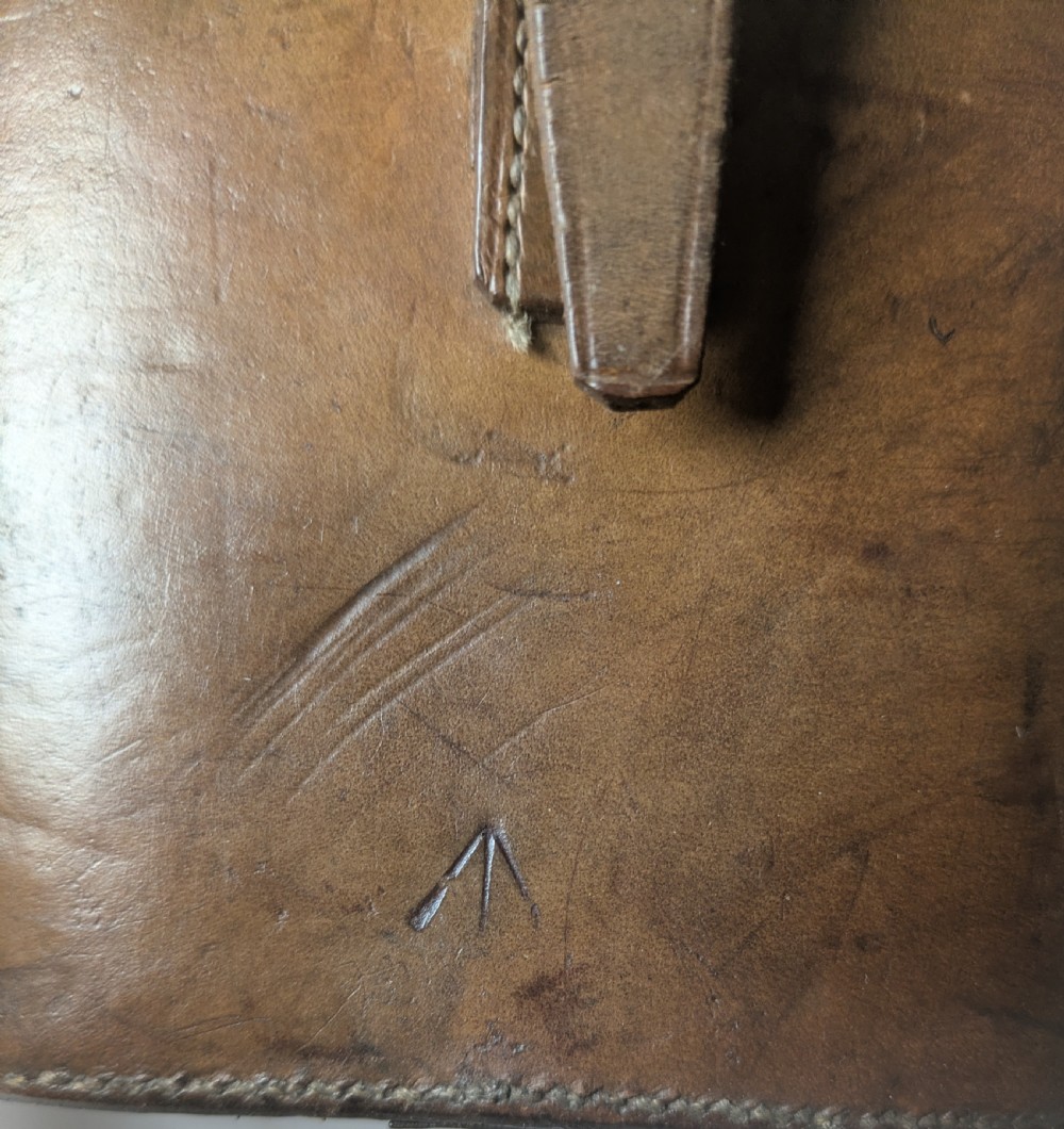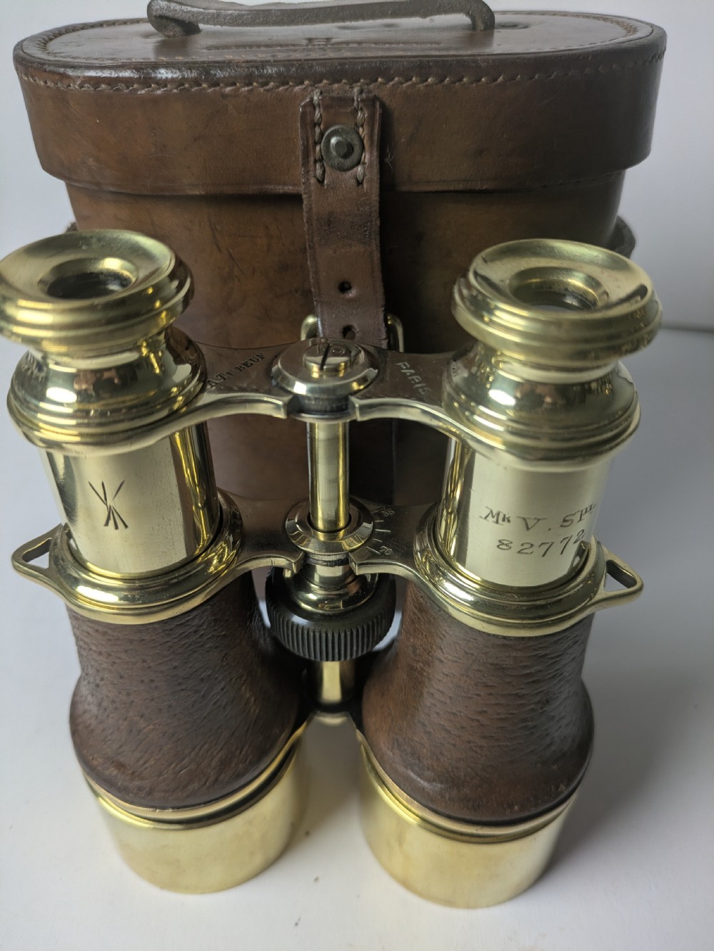 Both the brass on the binoculars and the leather case with the British military crows foot mark. The brass also engraved "Mk V Spr" and "82772".