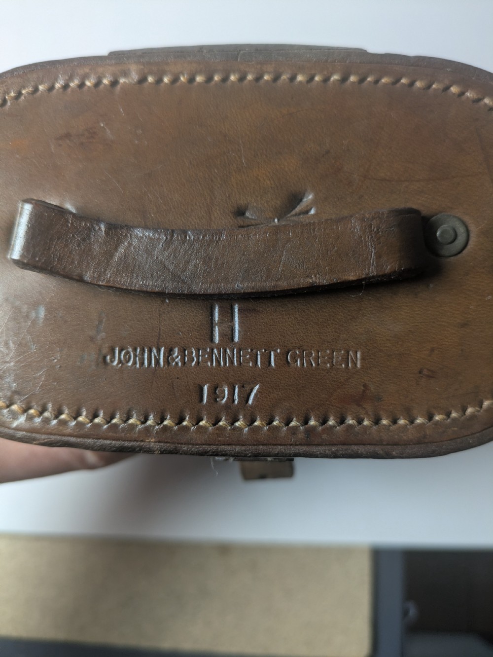 Superb condition having been professionally and meticulously polished restoring them to their former glory. The leather case has a lovely polished patina, measuring 5 3/4" x 3 1/4" x 6 3/4". The case impressed with the maker's name "John & Bennett Green" and dated 1917.