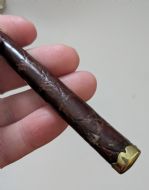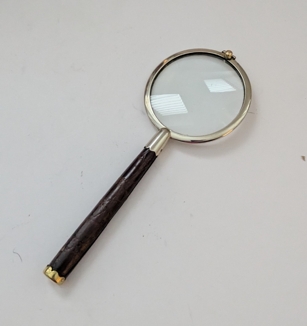 A smart and elegant magnifying glass with polished nickel and brass fittings and an attractive dark cognac coloured and textured leather covered handle to emulate crocodile skin. The frame is signed by the well renowned maker, P H Vogel & Co. and "Made In England". The undamaged lens is clear with a good magnification ready for use. Dating to c.1920, it remains in excellent condition measuring 6 3/4" x 2 1/2". Item: 44581 FREE Worldwide Registered Airmail Directly From London, England FREE Worldwide Shipping Directly From London, England Internal Ref: 44581