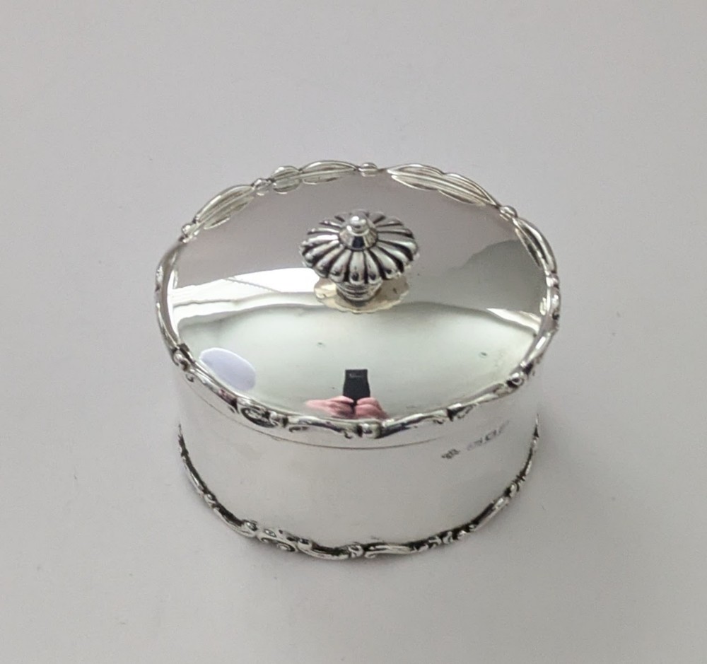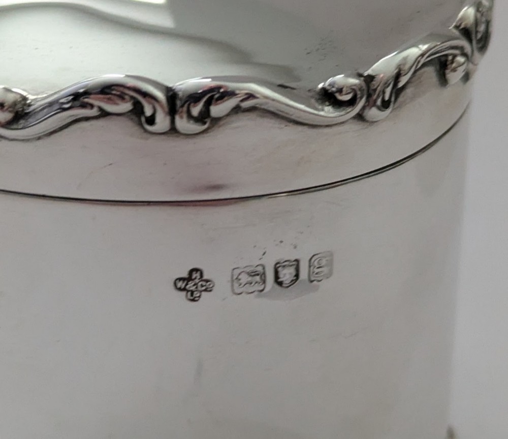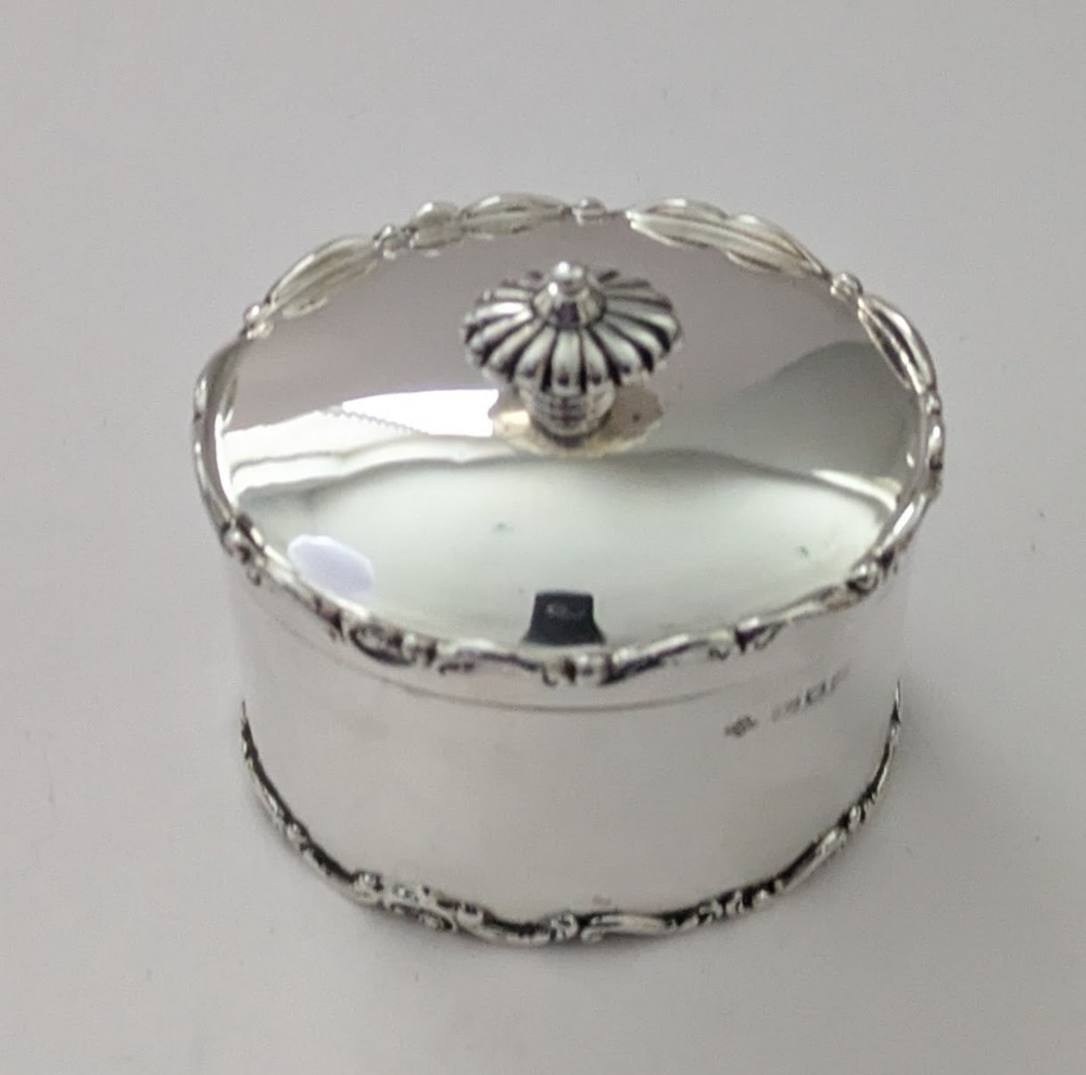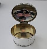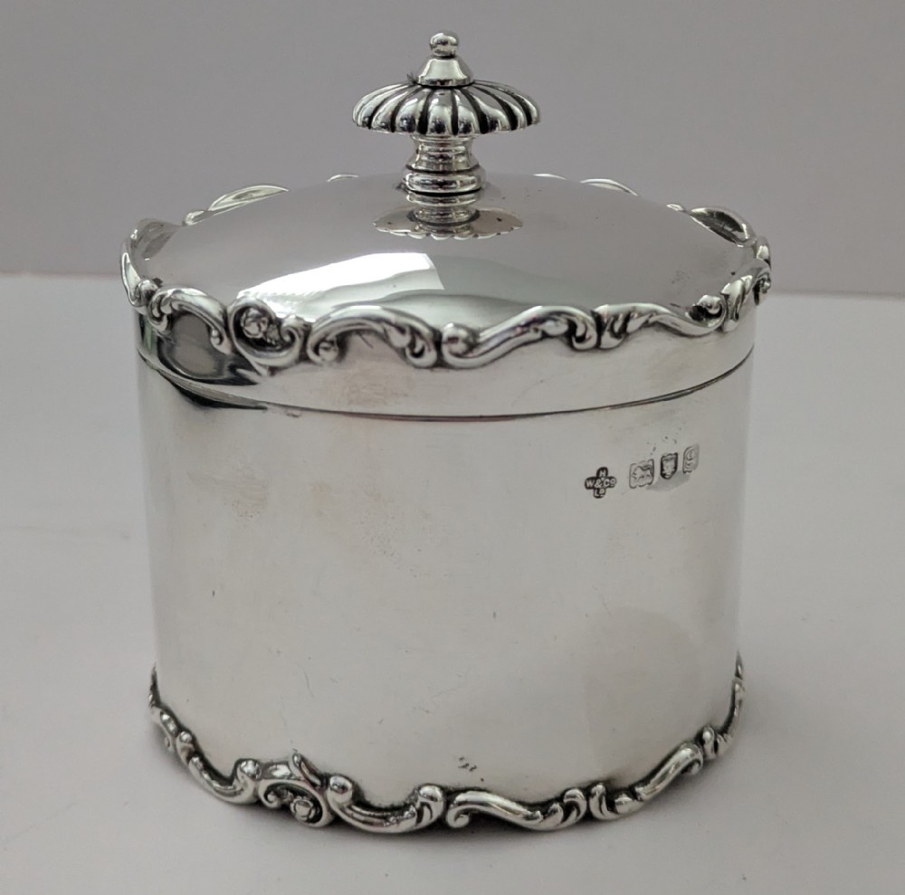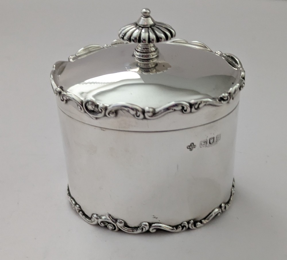 A stunning tea caddy, oval in shape with a simple elegant body and domed lid, both upper and lower rims beautifully decorated with a raised border. The hinged lid working perfectly and lid shutting well, the interior of the box is gilded. Fully hallmarked for London 1902, Edwardian in era together with the makers marks for Horace Woodward & Co Ltd. Excellent condition measuring 3 1/4" wide x 2 1/2" deep x 4" tall to top of finial. Weighing 161 grams / 5.18 Troy Ounces. Item: 44994 FREE Worldwide Registered Airmail Directly From the UK FREE Worldwide Shipping Directly From London, England Internal Ref: 44994
