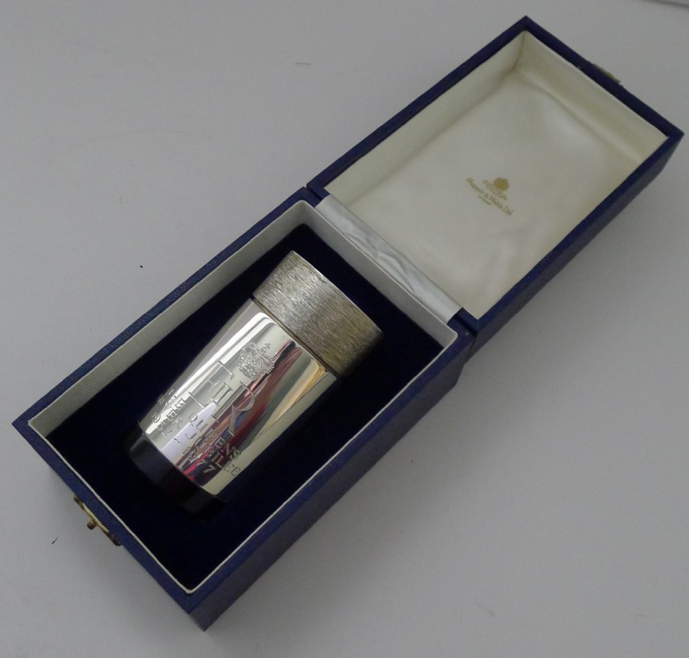 A wonderful and highly collectable solid / sterling silver pepper mill created in a modernist design for the top quality London silversmith, Mappin & Webb. The mill looks to have been rarely used and comes complete with it's original presentation case. The silver is fully hallmarked on the back for London 1977 together with the Elizabeth II silver jubilee head mark; also marked by the silversmith, Mappin & Webb. The top fastener is beautifully cast in the form of a crown, which unscrews to open the pepper mill; the pepper mill fittings made by the English maker, Park Green & Co. An heirloom collectable in superb condition weighing 208.7 Grams / 6.71 Troy Ounces and measuring 4" tall with a base diameter measuring 2"; the box measures 6" x 4" x 3 1/2". Item: 45996 FREE Worldwide Registered Airmail Directly From the UK FREE Worldwide Shipping Directly From London, England Internal Ref: 45996