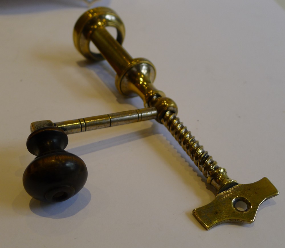 A most unusual antique English Corkscrew made from sold brass and an Ebonised Fruitwood knob at the end of the crank.