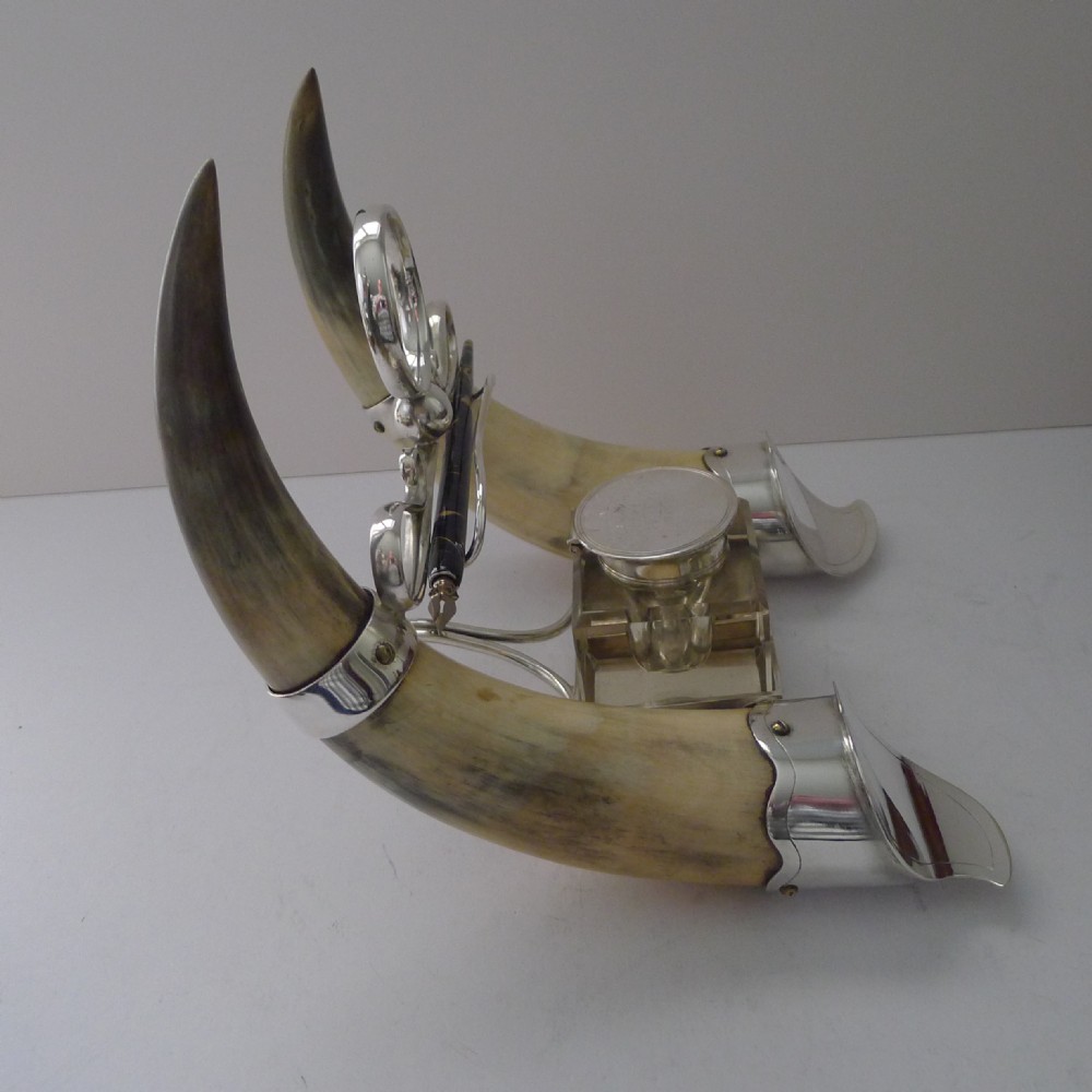 An outstanding late Victorian inkwell made from two cattle horns and mounted with silver plated fittings, a stunning combination and always highly sought-after; I haven't had one of these for several years. The large inkwell is made from a hefty piece of crystal with a hinged lid, engraved clearly as a presentation piece in 1897, some usual wear to the plate on the interior. Below the ring handle, is an integral pen rest for one's dip pen (the one shown is a new example which I am including in the sale to complete the look) Excellent condition measuring 8 1/2" x 8 1/2" x 8 1/2" tall. The glass inkwell measuring 2 1/2" square. Item ID:36736 FREE Worldwide Registered Airmail Directly from London, England FREE Worldwide Shipping Directly From London, England Internal Ref: 36736