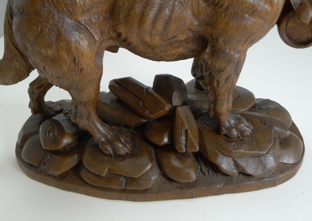 This is the largest example I have had. A magnificent and intricate Black Forest St. Bernard carving, beautifully executed and retaining his original pair of glass eyes. Excellent condition with a good bright patina measuring 15" x 7 3/4" and standing 12" tall. Victorian in era, c.1890/1900.