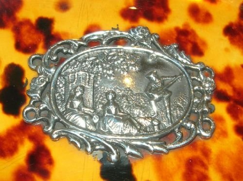 The glossy shell is enhanced with a sterling (unmarked) silver mount featuring a pretty period scene of a gentleman serenading two ladies.