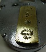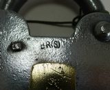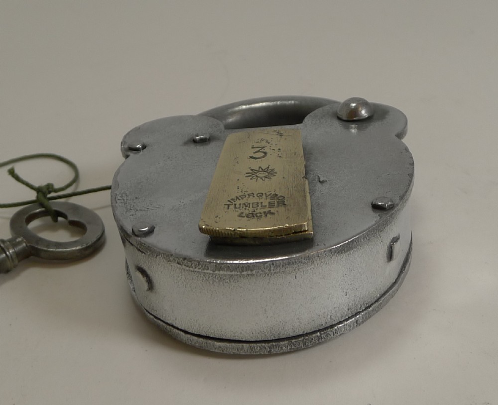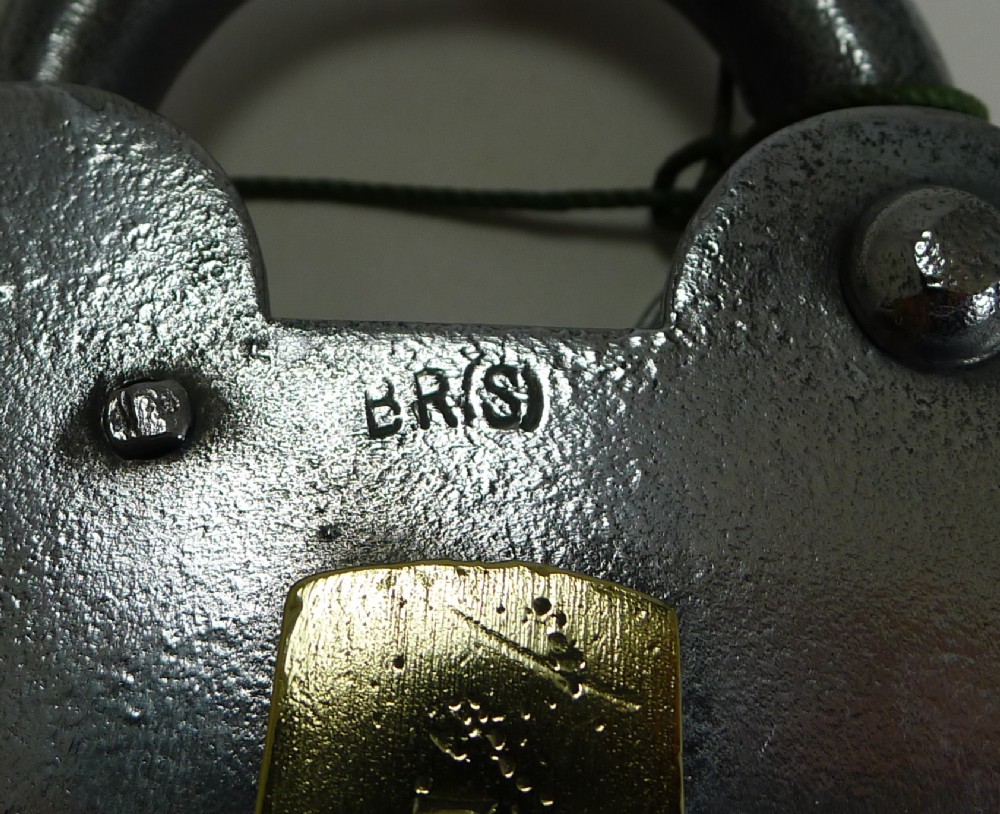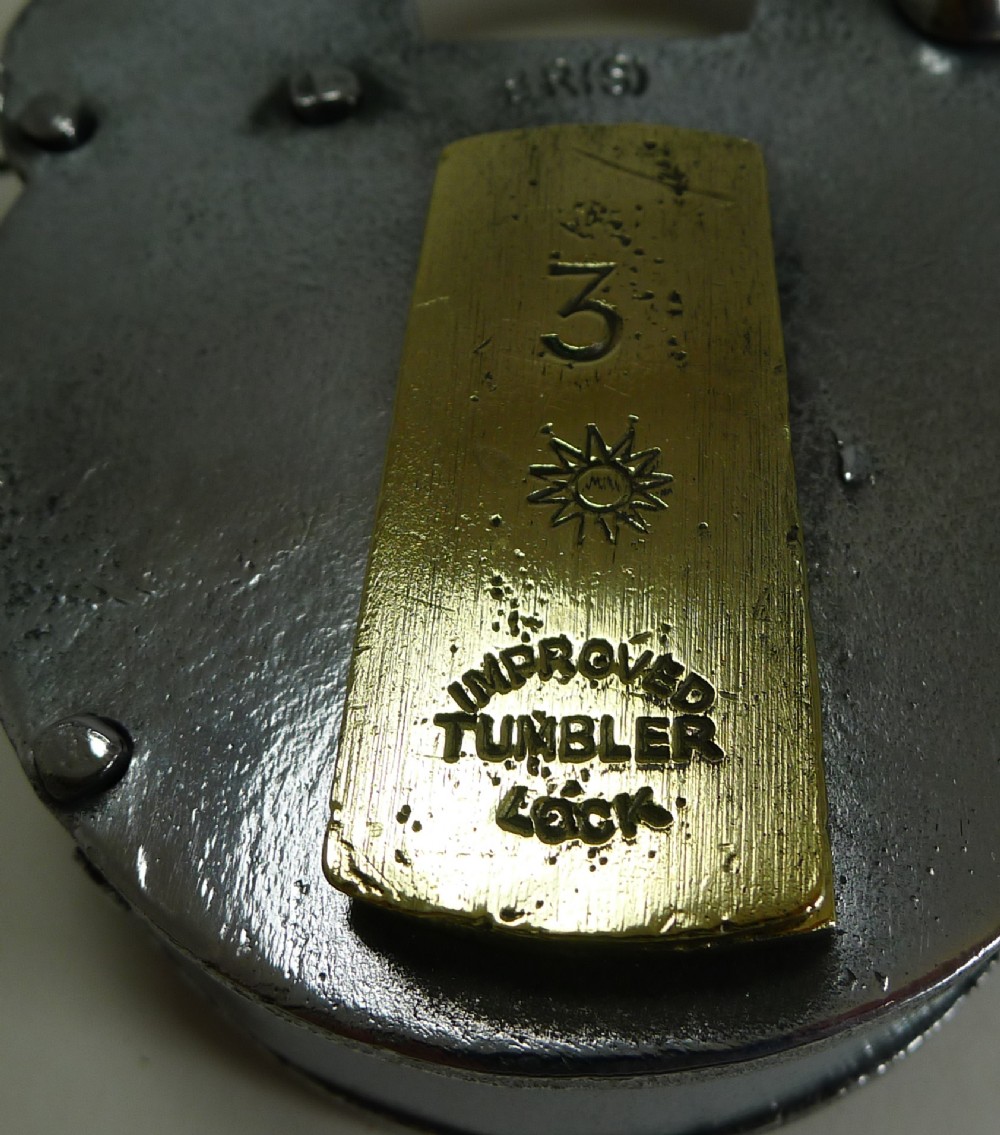 A handsome large English Victorian padlock made from polished steel with a brass lock cover. The cover is marked 3 with a stylised sun and "Improved Tumbler Lock", above the cover the steel is marked BR(S).