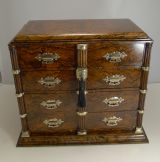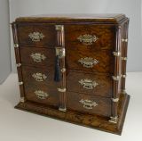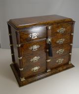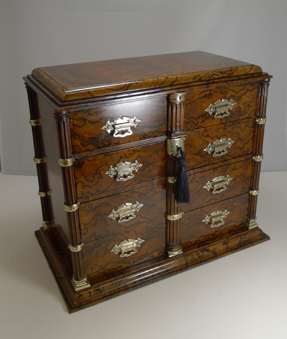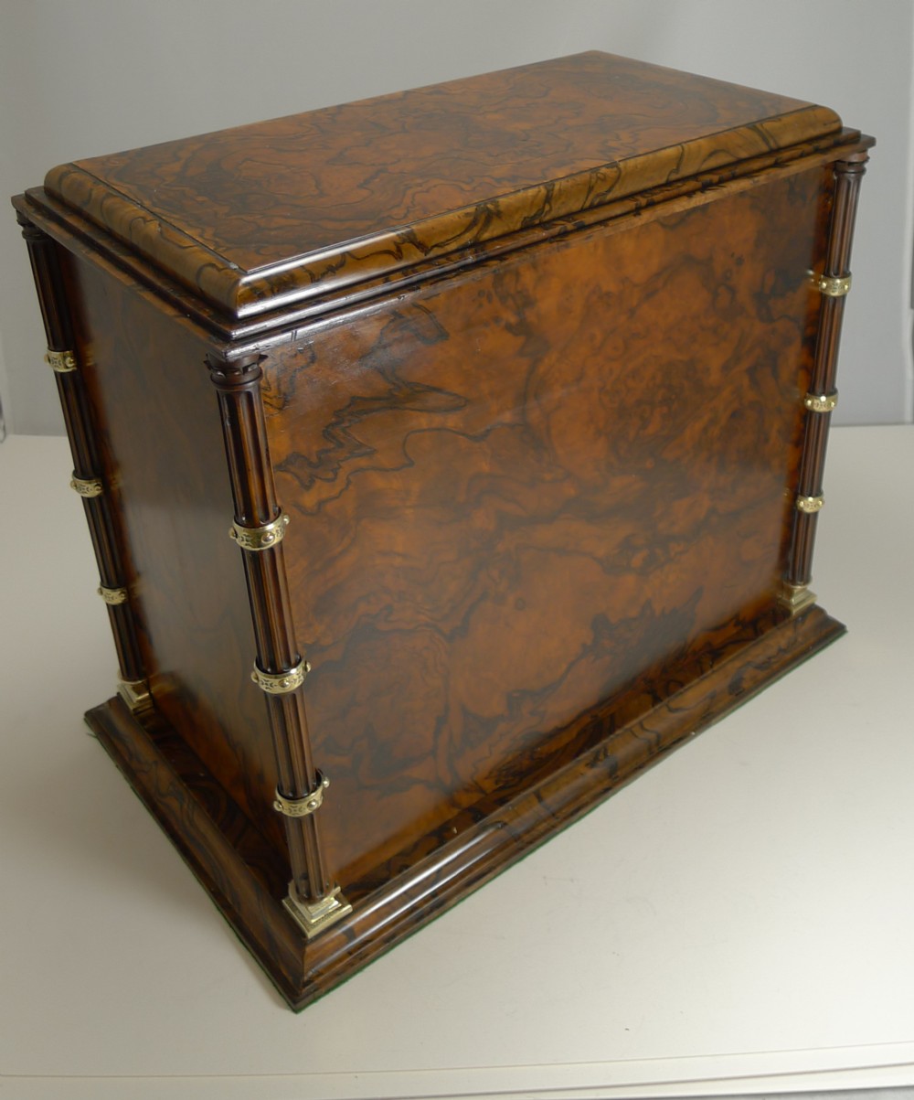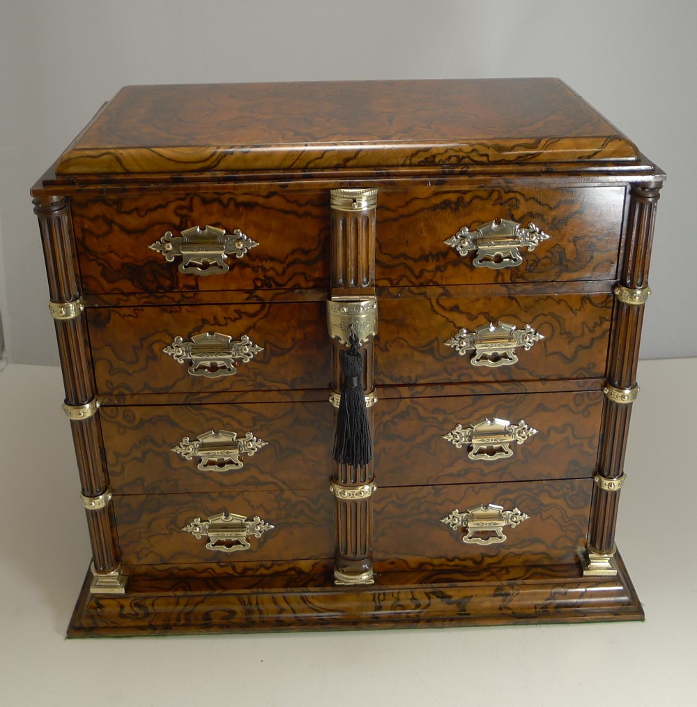 About as fine as they get, this large Burr Walnut cigar cabinet is a magnificent quality box beautifully made. Each corner has a carved column with a polished brass base and brass mounts around the columns, all beautifully hand engraved. All of the drawer pulls are again hand-engraved. This cabinet would have come from a very fine house, this type of box was used for entertaining, the top two drawers easily accessed by releasing the top (unlocked) shorter bar. These two drawers would have been placed on the table, you can see that they are finished in burr walnut on all sides, used to serve; the underside reveals Satinwood used to finish. The bottom (locked) drawers are accessed with the working key releasing the long bar which then allows the drawers to be accessed. Various cigars would be stored in these drawers and a variety placed in the top two drawers ready for table service by the Butler. The interior of the drawers is lined in Cedar wood which is what kept cigars fresh; this is not officially a Humidor as these are modern inventions to regulate the humidity within; it is the Cedar lining that did this job well over 100 years ago. Each of the drawers has an adjustable / removable divider to customise the interior's configuration. The drawers will accommodate a maximum cigar length of 6 1/4". Truly the finest in excellent condition, minor wear commensurate with age. Dating to the late Victorian period. The footprint measures 17 1/2" x 10 1/2" x 15" tall. Item ID: 41002 FREE Worldwide Registered Airmail Directly From London, England FREE Worldwide Shipping Directly From London, England Internal Ref: 41002