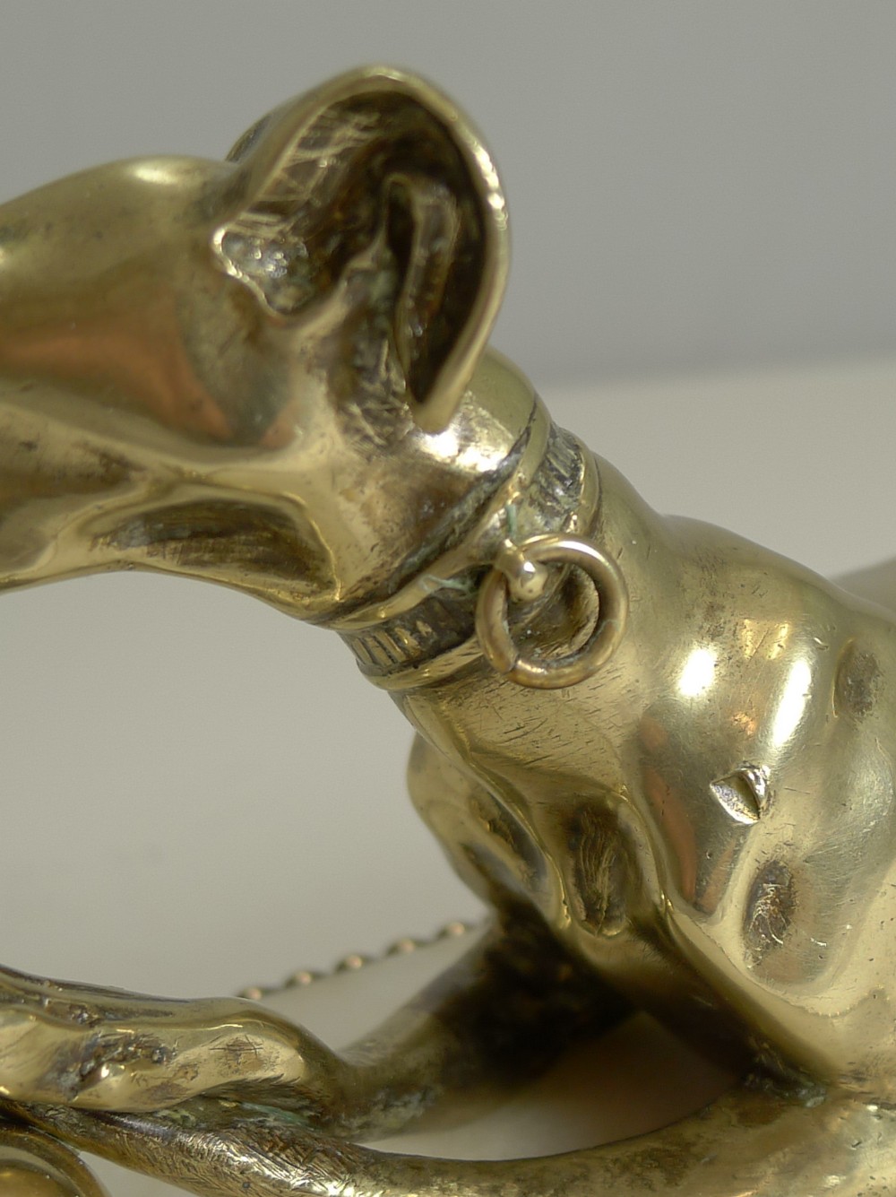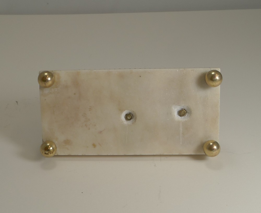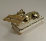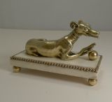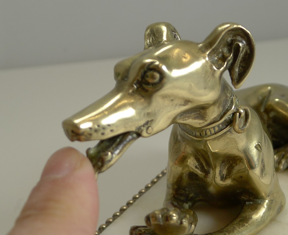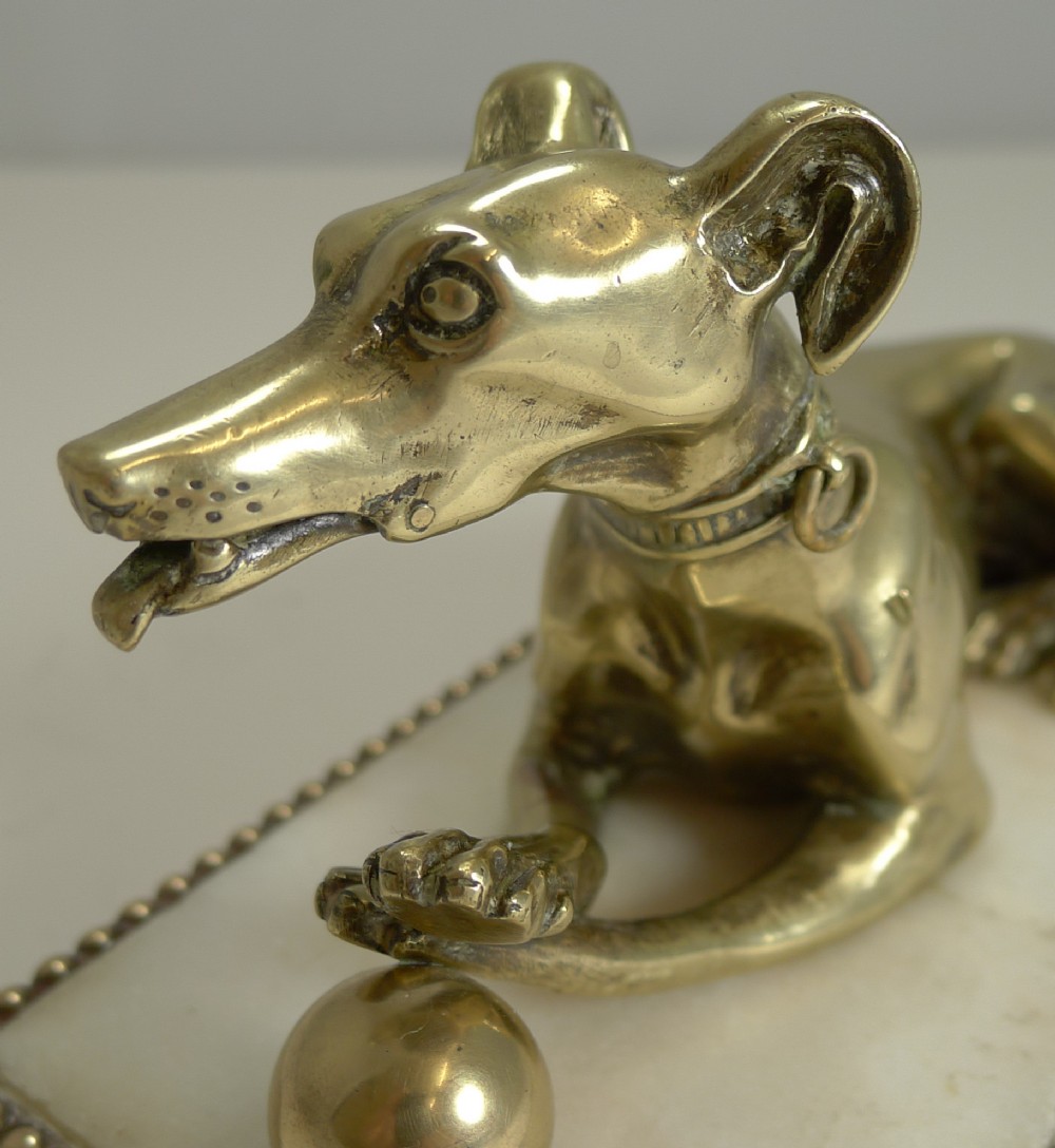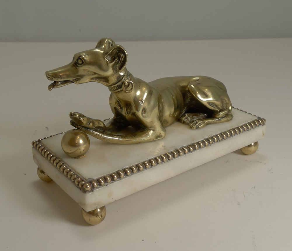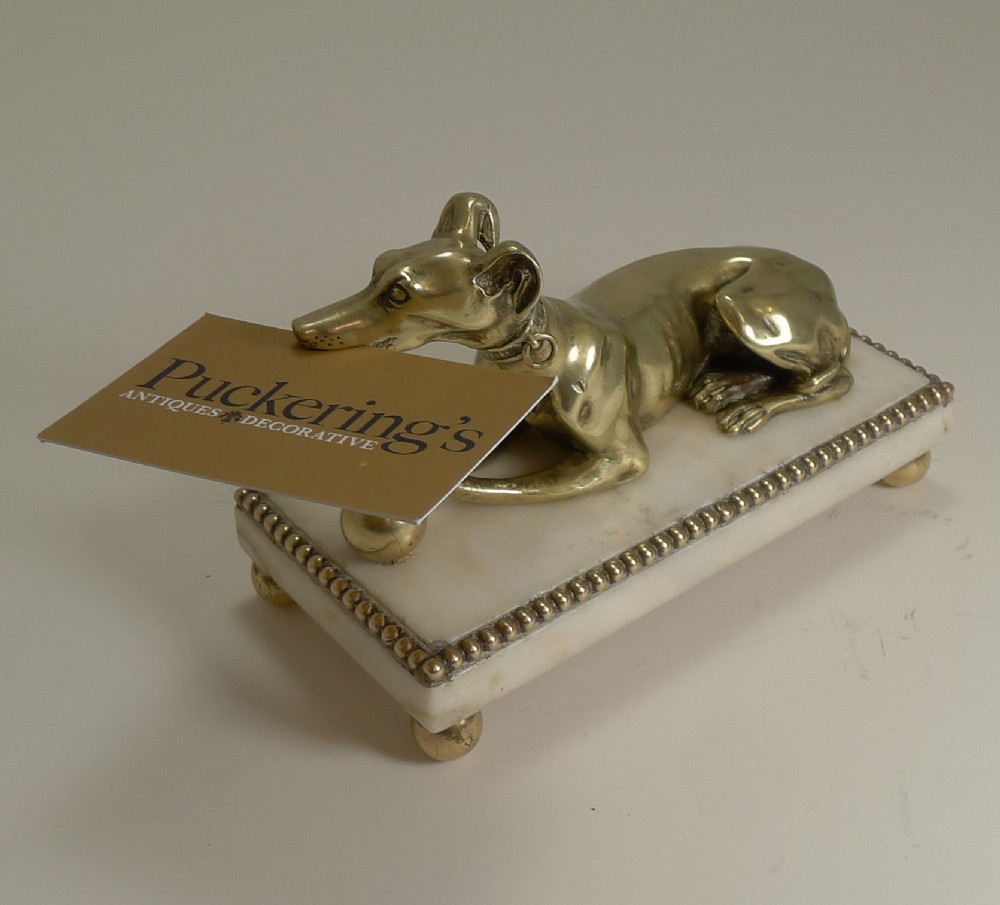 A wonderful and most unusual desk-top accessory, a novelty paper or note clip in the from of a very handsome Greyhound. Figured in cast English brass, the dog has his crossed paws on a ball and has detail such as collar with loose movable leash ring. The side of his jaw reveals the pin where the jaw can be opened to hold a letter or note, it makes a perfect business card holder. The figure sits on a solid marble plinth supported by four spherical brass feet. Excellent condition with minor wear commensurate with age and wear. Victorian in era and dating to c.1860. 6 3/4" x 3 1/4" x 3 1/2". Item ID: 41010 FREE Worldwide Registered Airmail Directly From London, England FREE Worldwide Shipping Directly From London, England Internal Ref: 41010