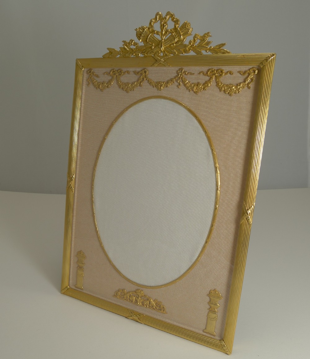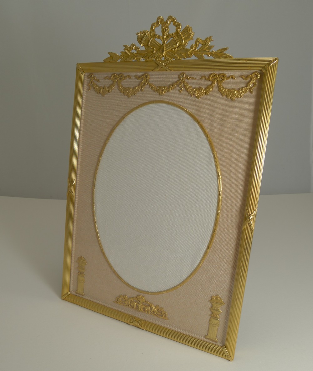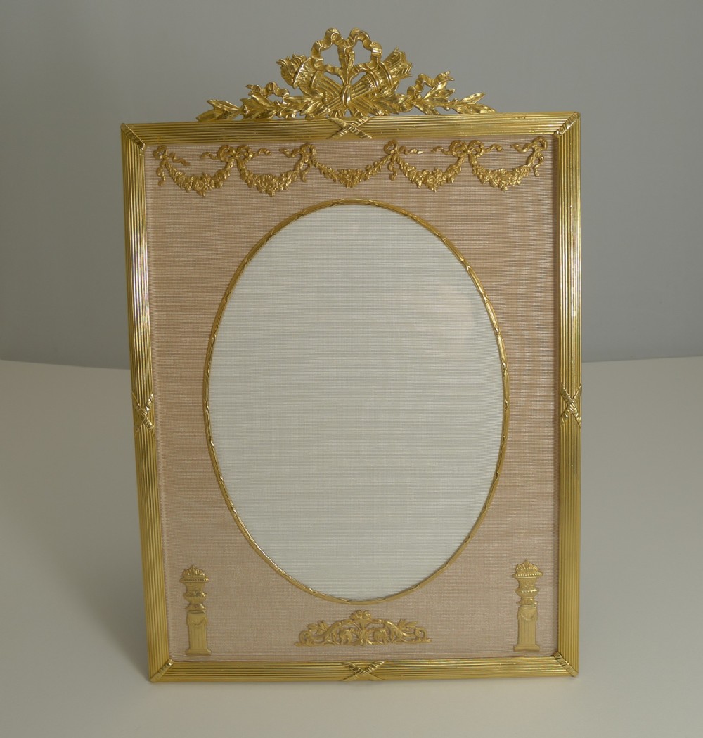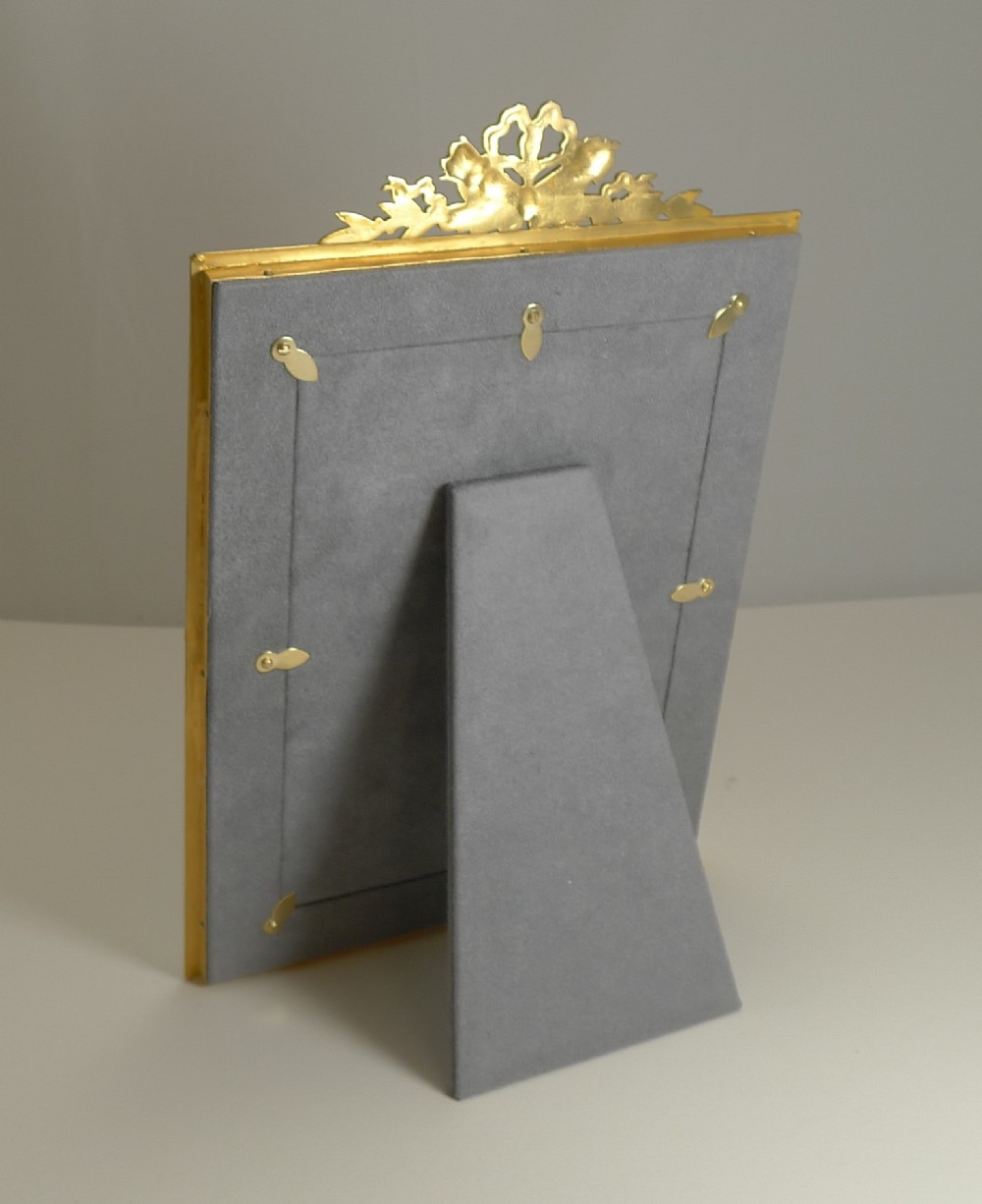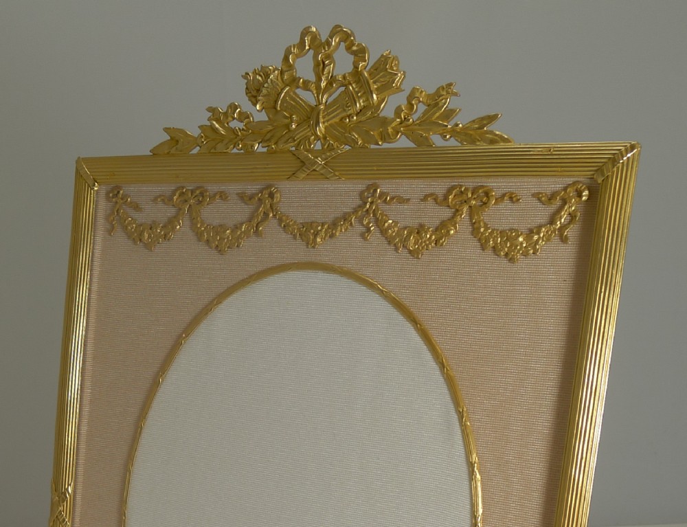 Made from Ormolu or gilded bronze, it has been meticulously restored to it's former glory with a bright patina, clean silk taffeta and a recovered backing incorporating a folding easel back stand.