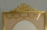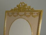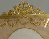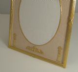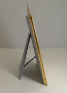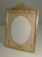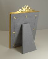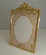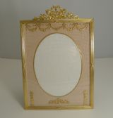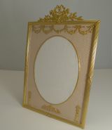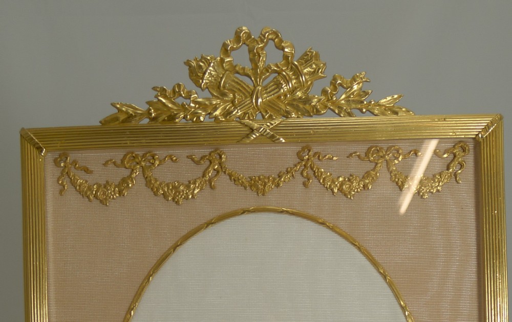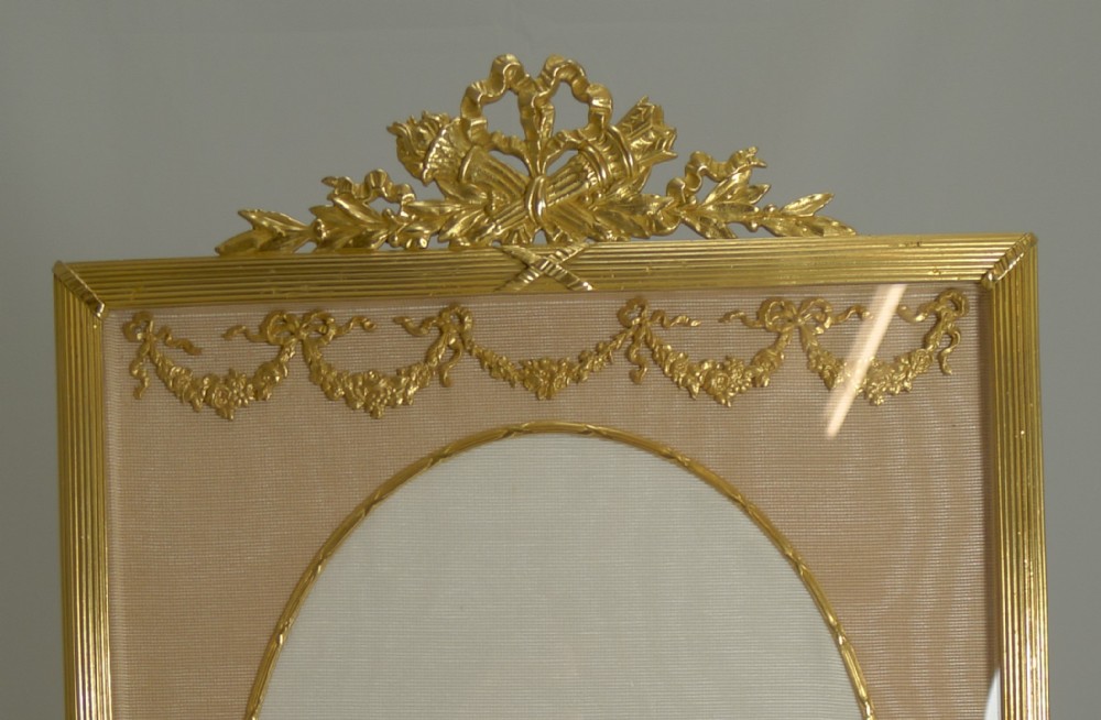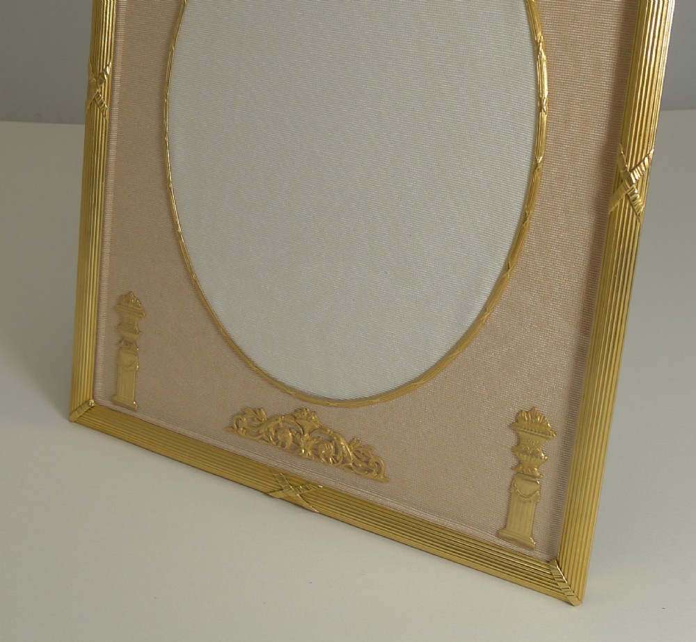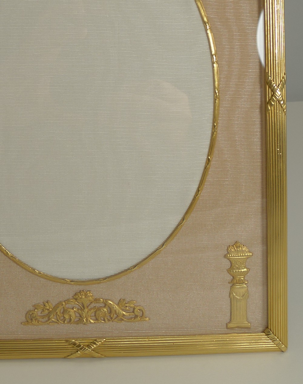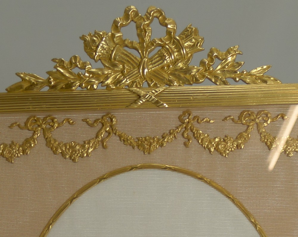 Made from Ormolu or gilded bronze, it has been meticulously restored to it's former glory with a bright patina, clean silk taffeta and a recovered backing incorporating a folding easel back stand.