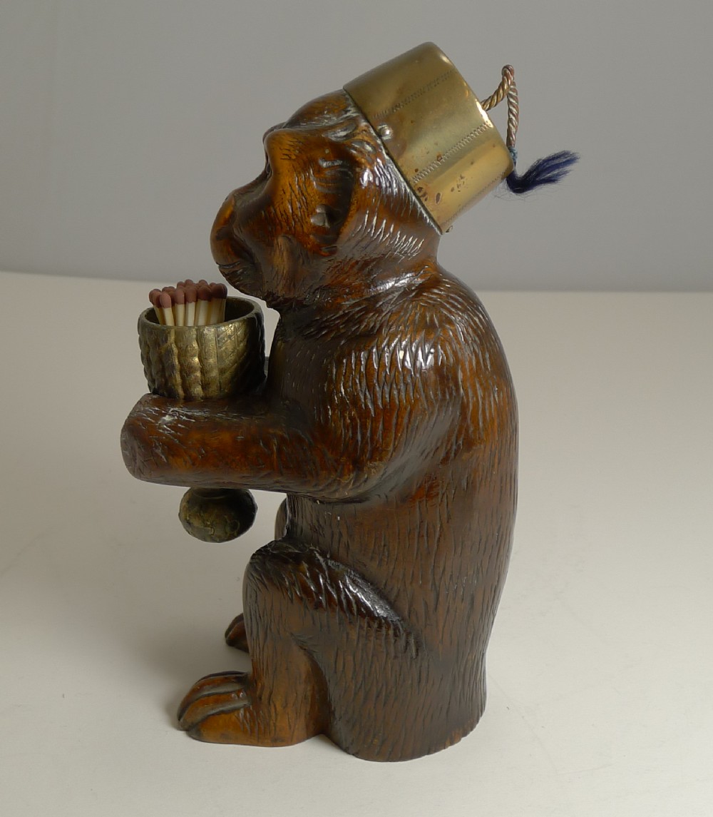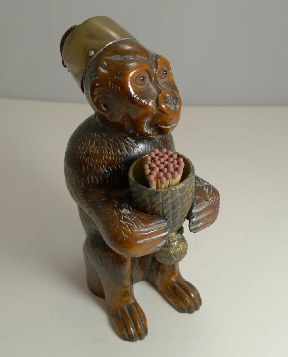 A rare and very fine hand-carved novelty match strike / table vesta in the form of a charming Monkey sporting his two glass eyes.