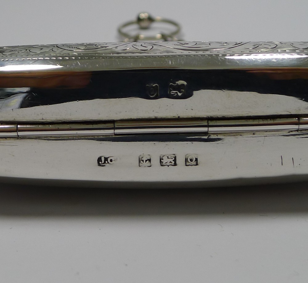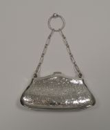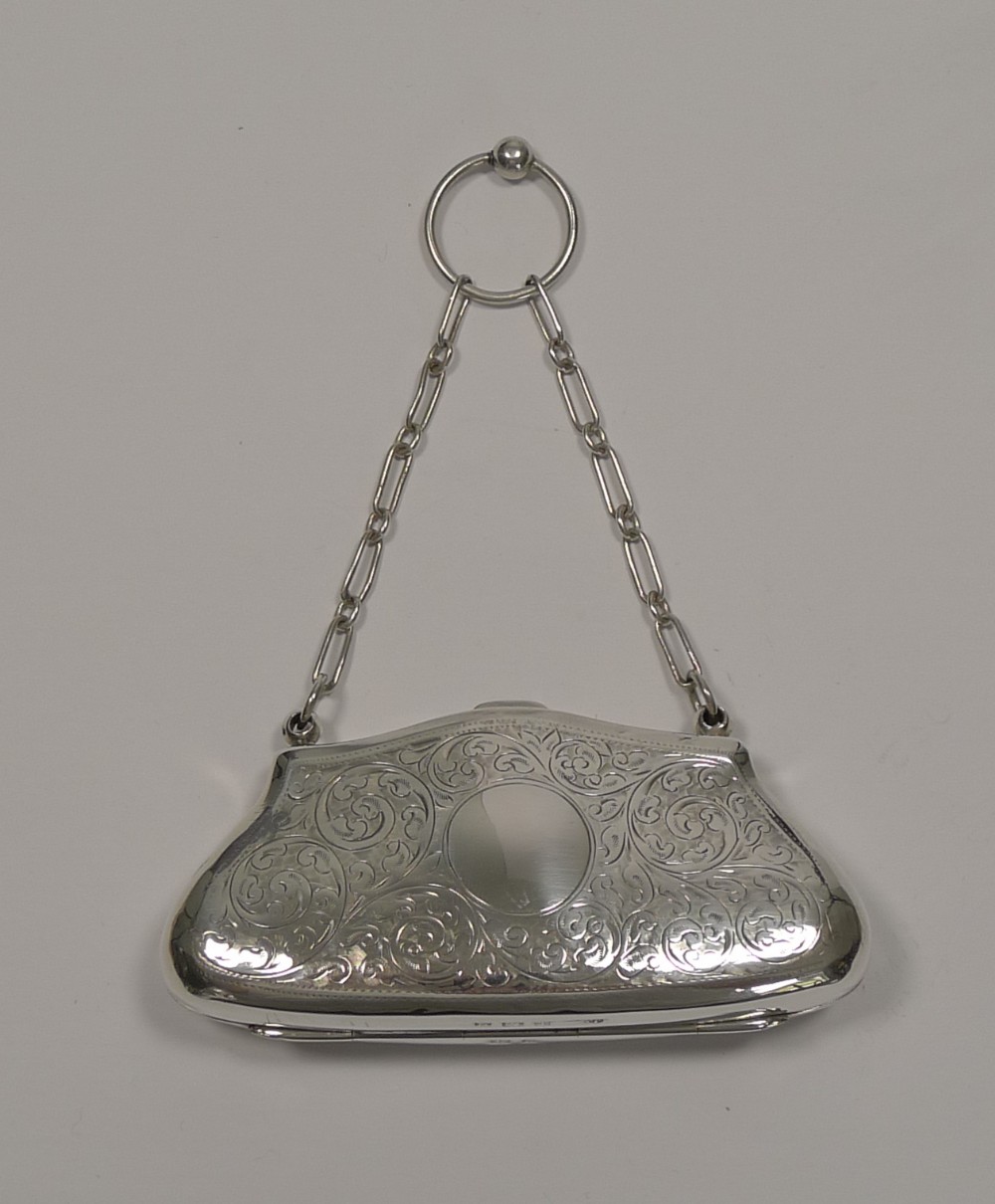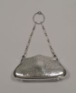 The front is decorated with engraving surrounding a vacant circular cartouche and all-over engraved decoration to the back. The purse hangs on a chain with a finger ring to the top.