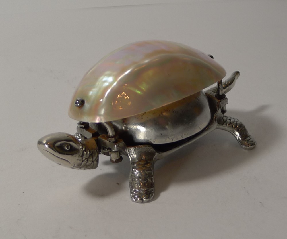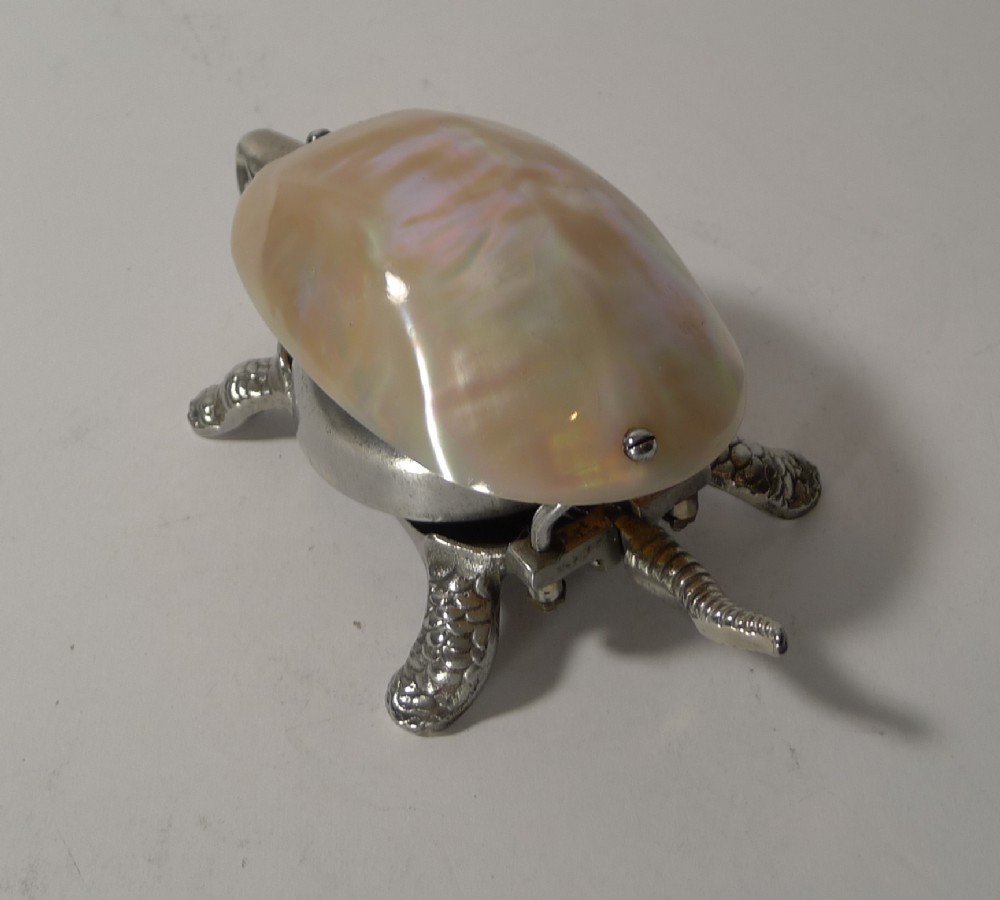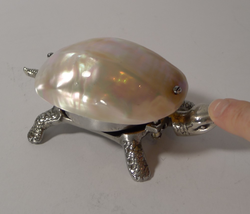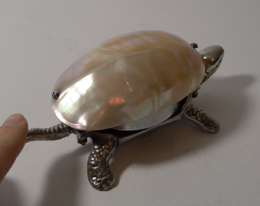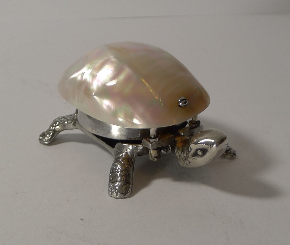 A fabulous and rare example of a novelty German mechanical bell made from a silver coloured metal in the form of the most charming tortoise.