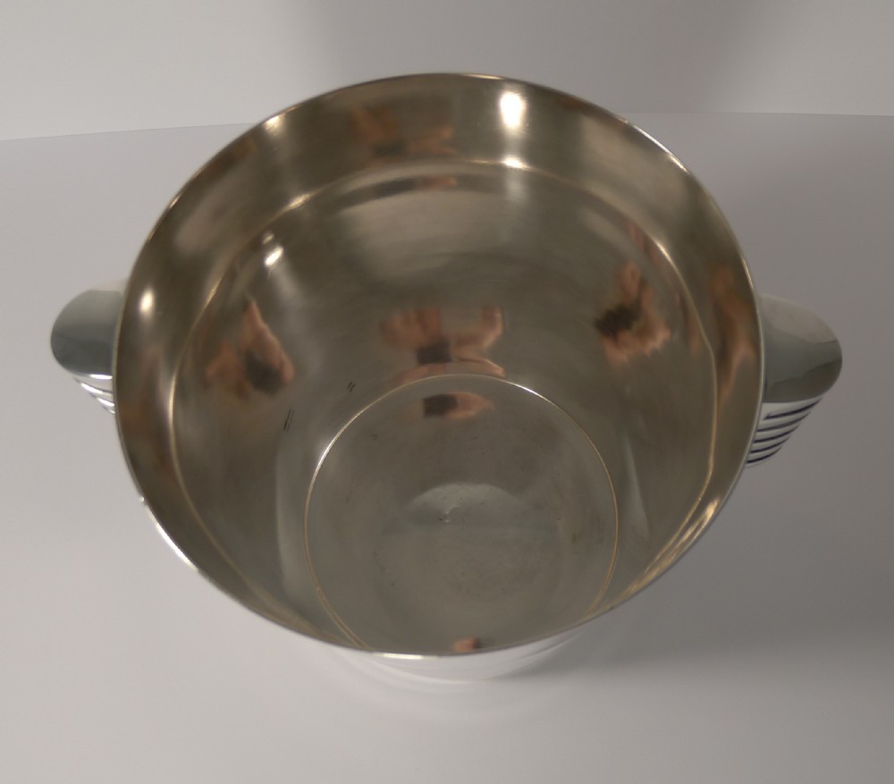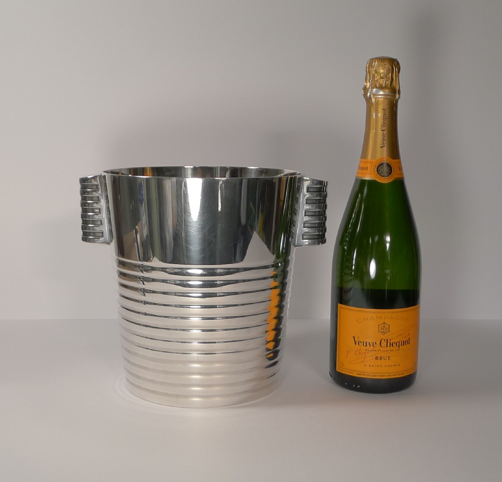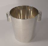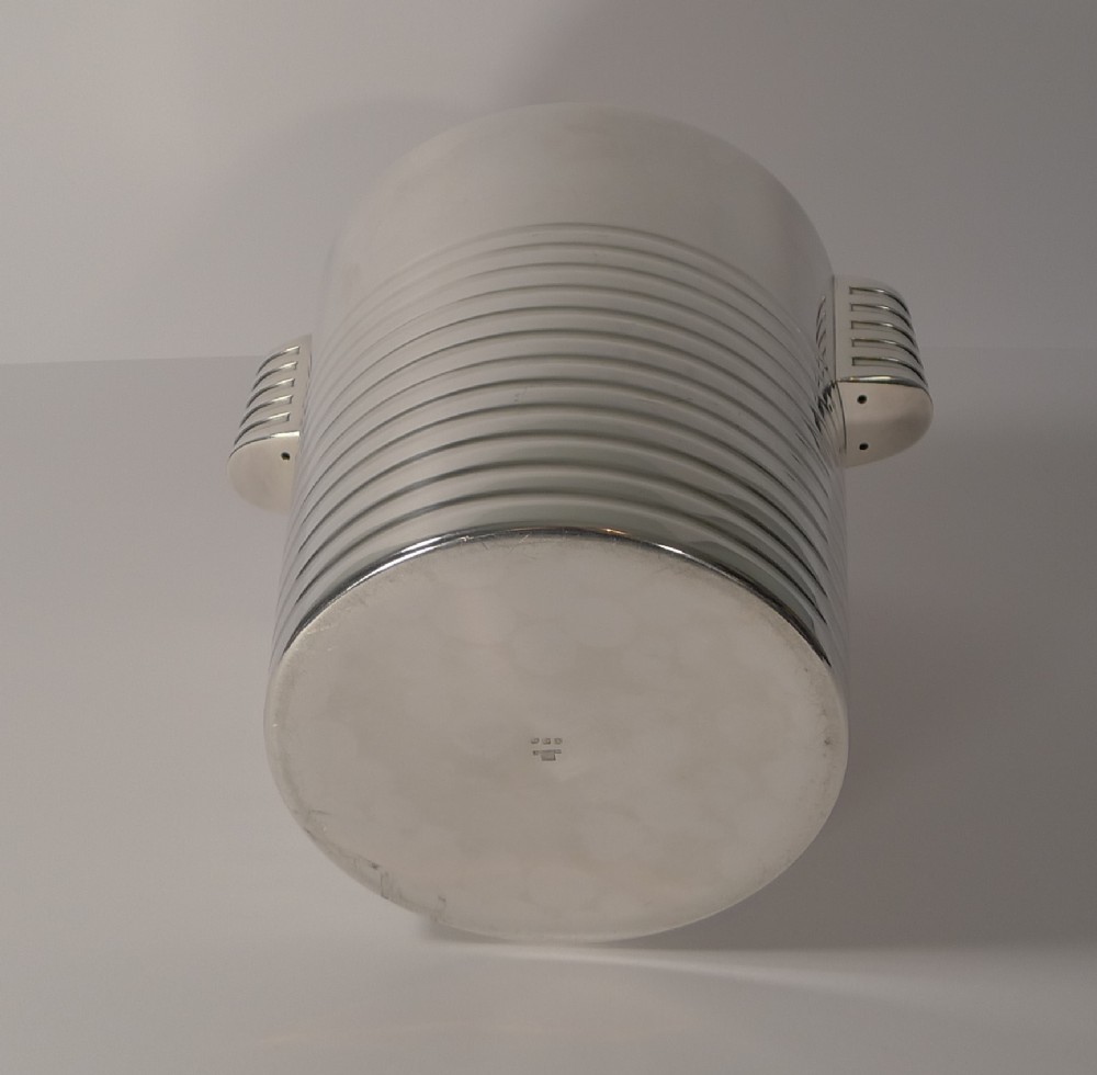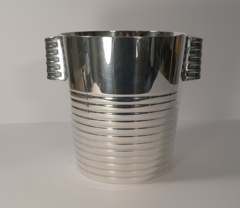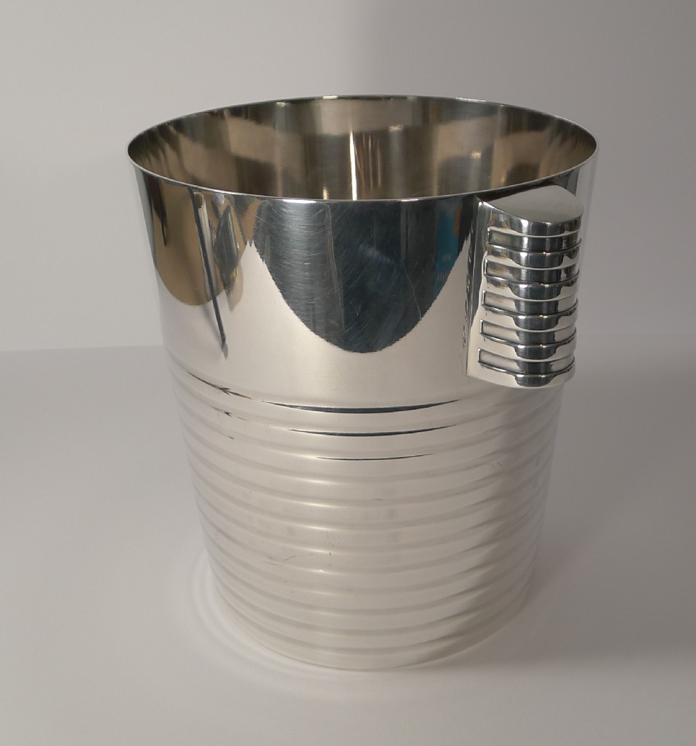 A fabulous Art Deco silver plated Champagne bucket designed by the celebrated Luc Lanel for Christofle designed in1932. A stylish ribbed vessel with with ribbed lug handles;