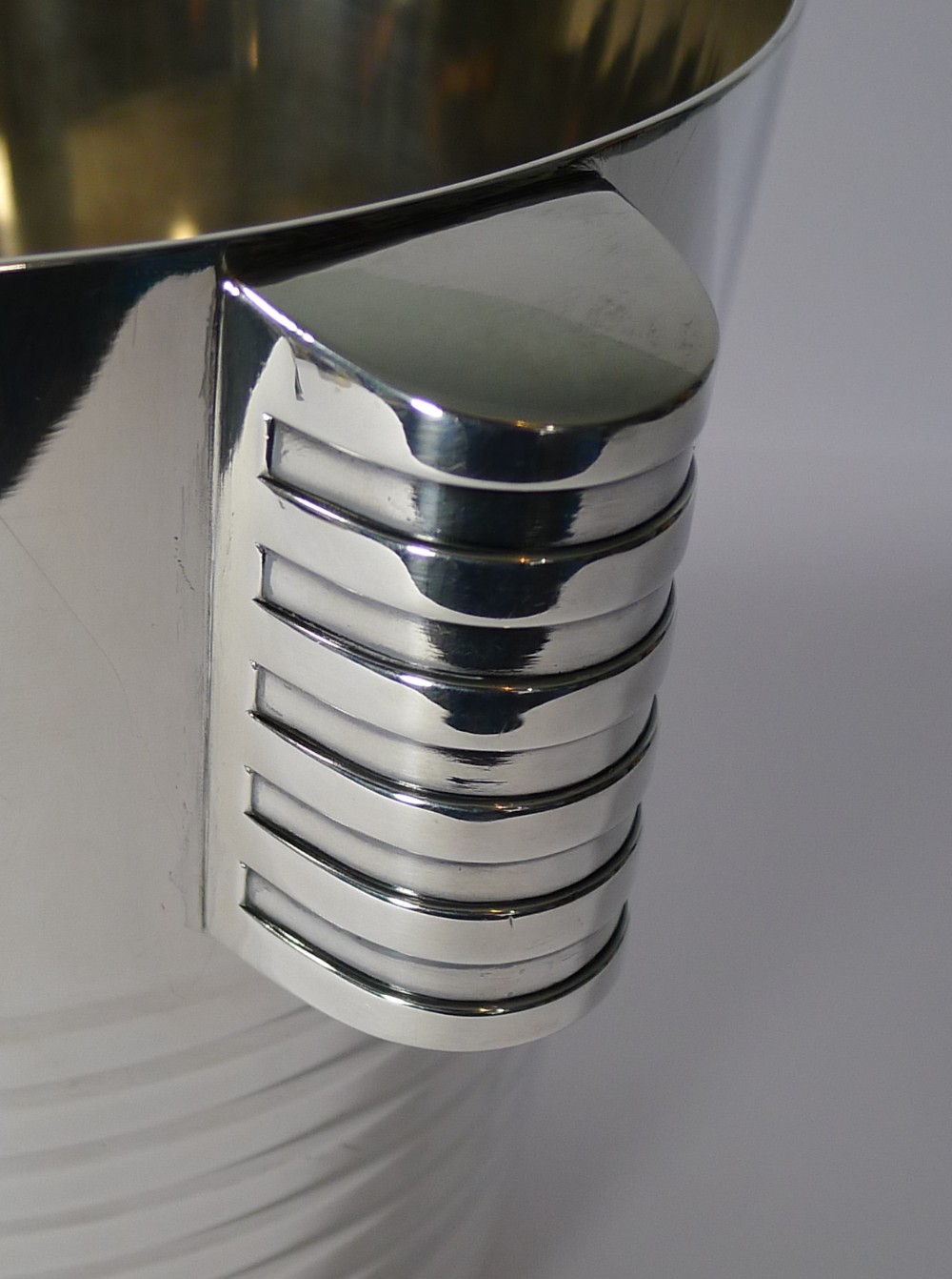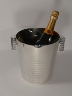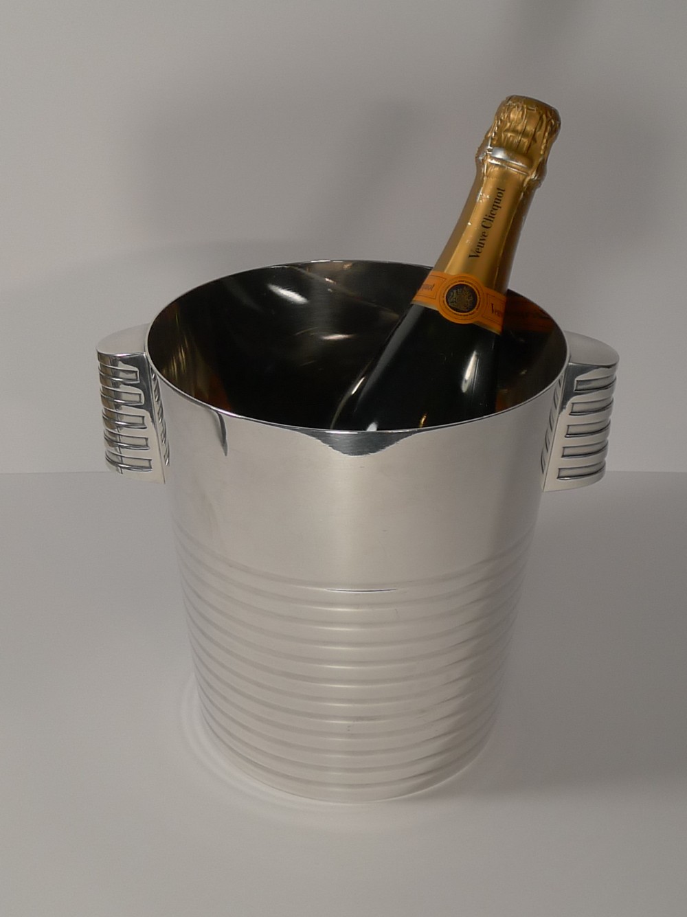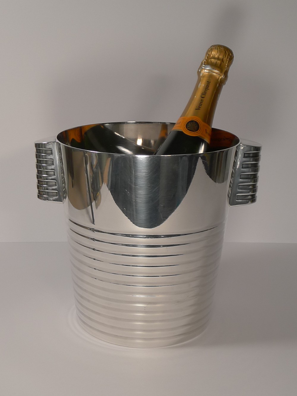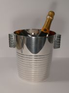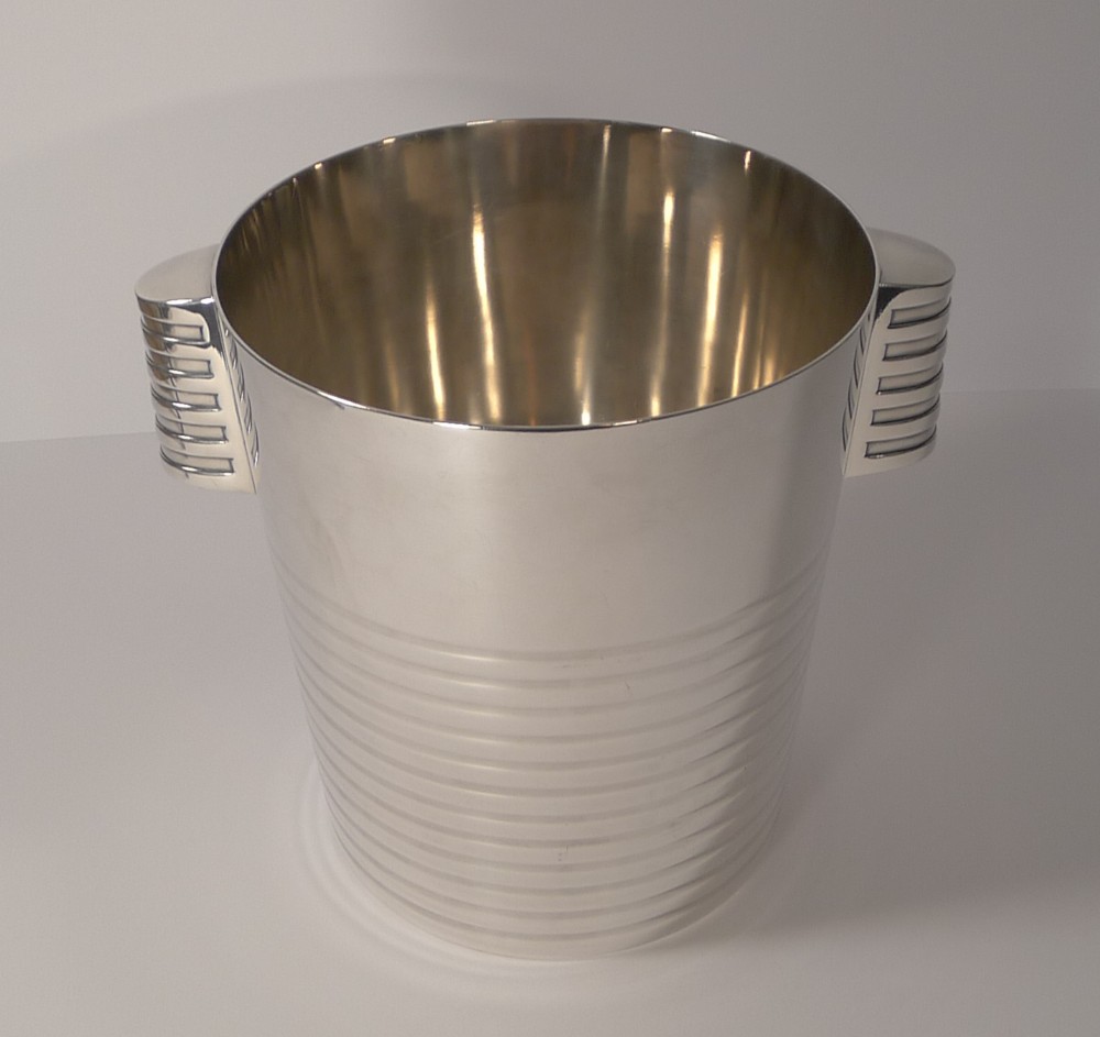 A fabulous Art Deco silver plated Champagne bucket designed by the celebrated Luc Lanel for Christofle designed in1932. A stylish ribbed vessel with with ribbed lug handles;