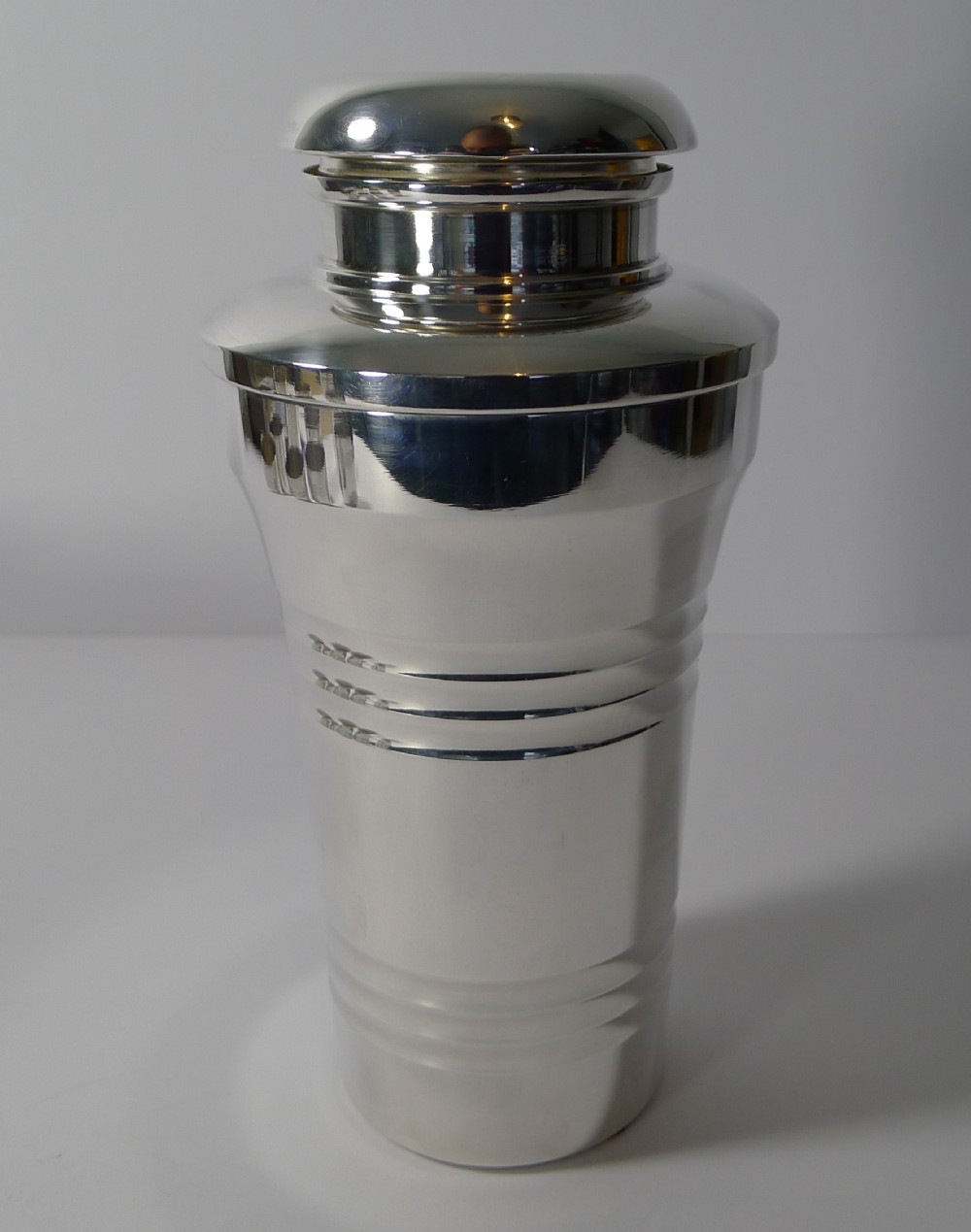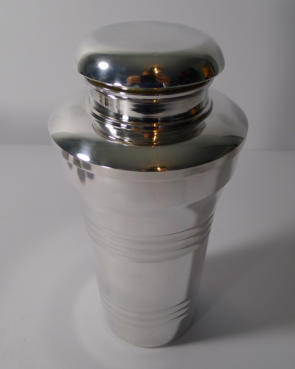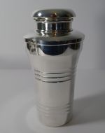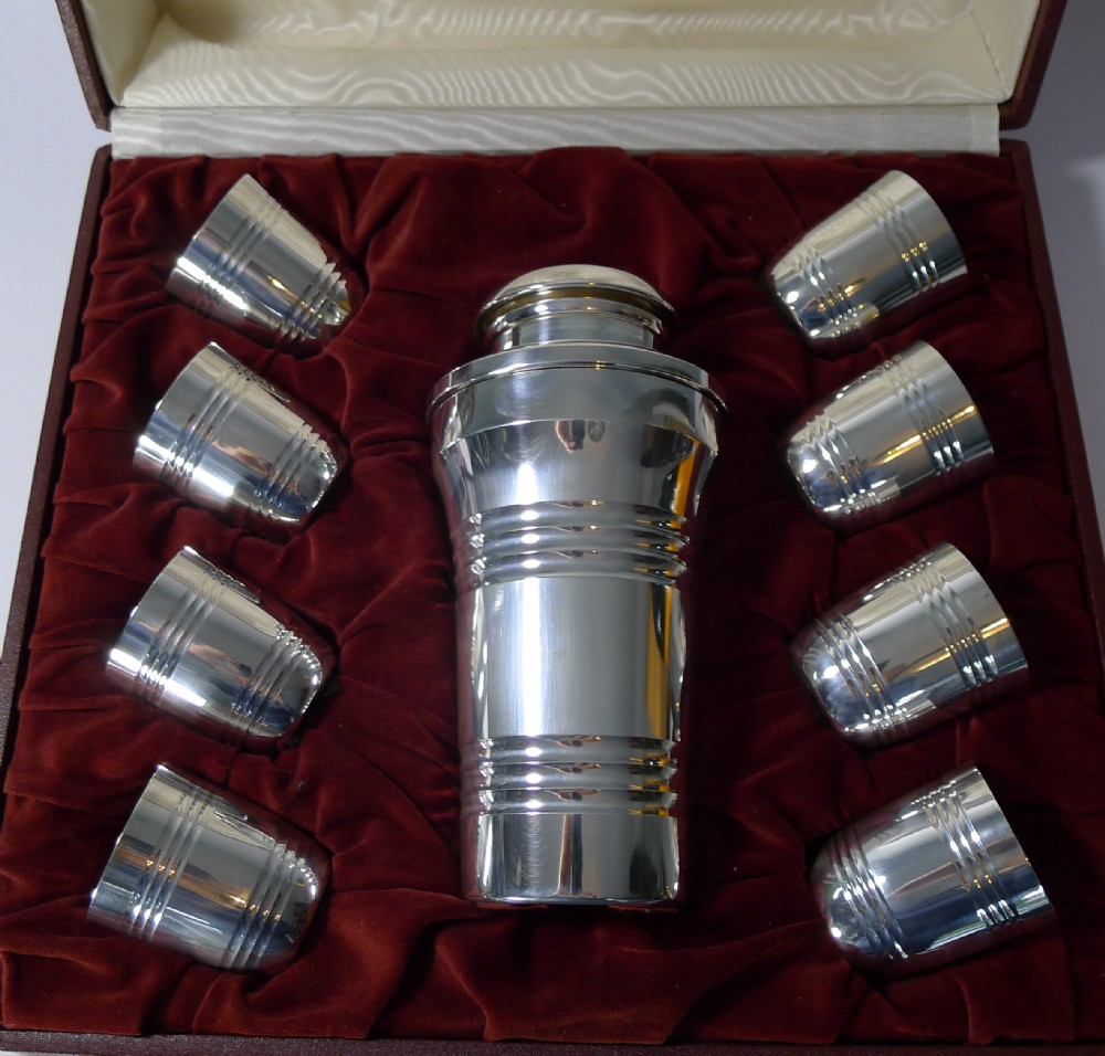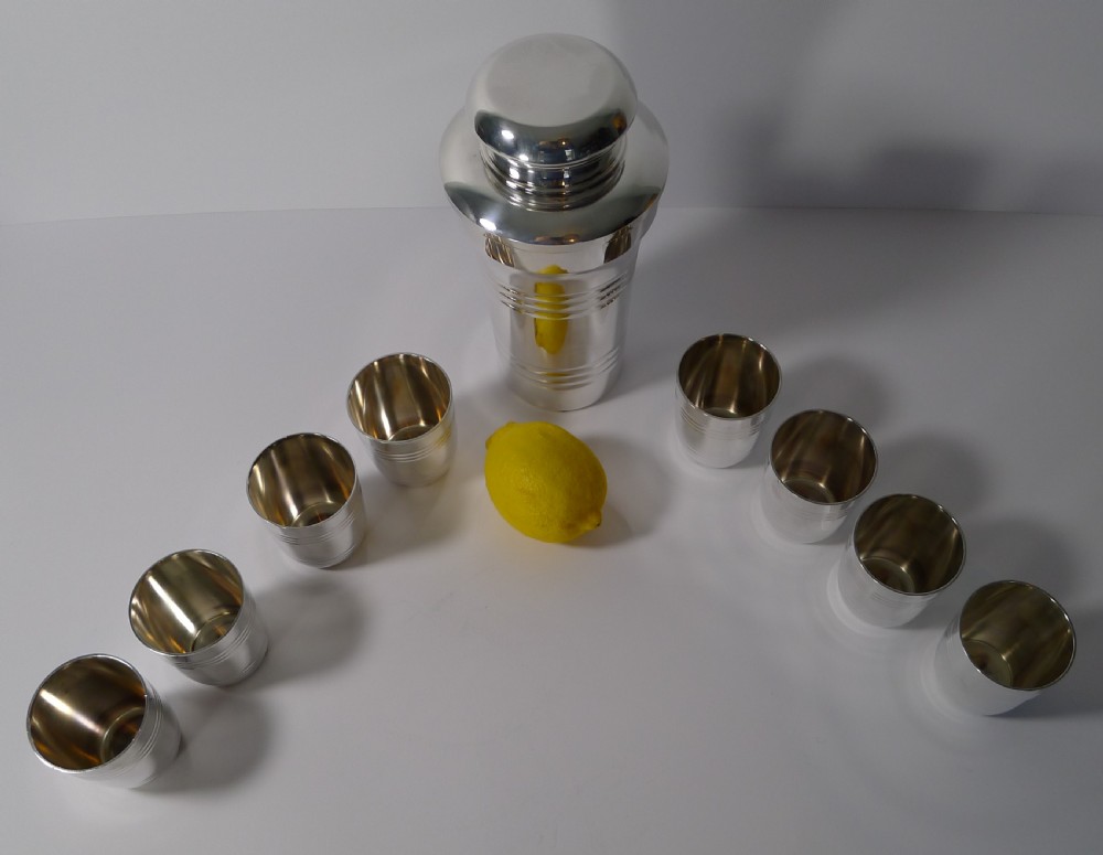 A magnificent and very stylish Art Deco cocktail set sitting in it's original presentation case. The set consists of a stunning cocktail shaker and eight small cups, all look to have rarely or never been used. They have clearly been on display as the previous owner have put some protective pads on the underside for display; I have left these intact. All pieces are marked by the well renowned French silversmith, St. Medard of Paris; the cream tafetta on the interior of the lid, printed in gold, "Orfevrerie Saint Medard". Dating to c.1940, the set remains in superb condition. The cocktail shaker has a maximum diameter measuring 4" and standing 8" tall; each cup has a rim diameter measuring 2" and standing 2 1/2" tall. The presentation box measures 13" x 14" x 4 3/4". Item: 42918 FREE Worldwide Registered Airmail Directly From the UK FREE Worldwide Shipping Directly From London, England Internal Ref: 42918