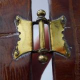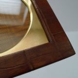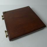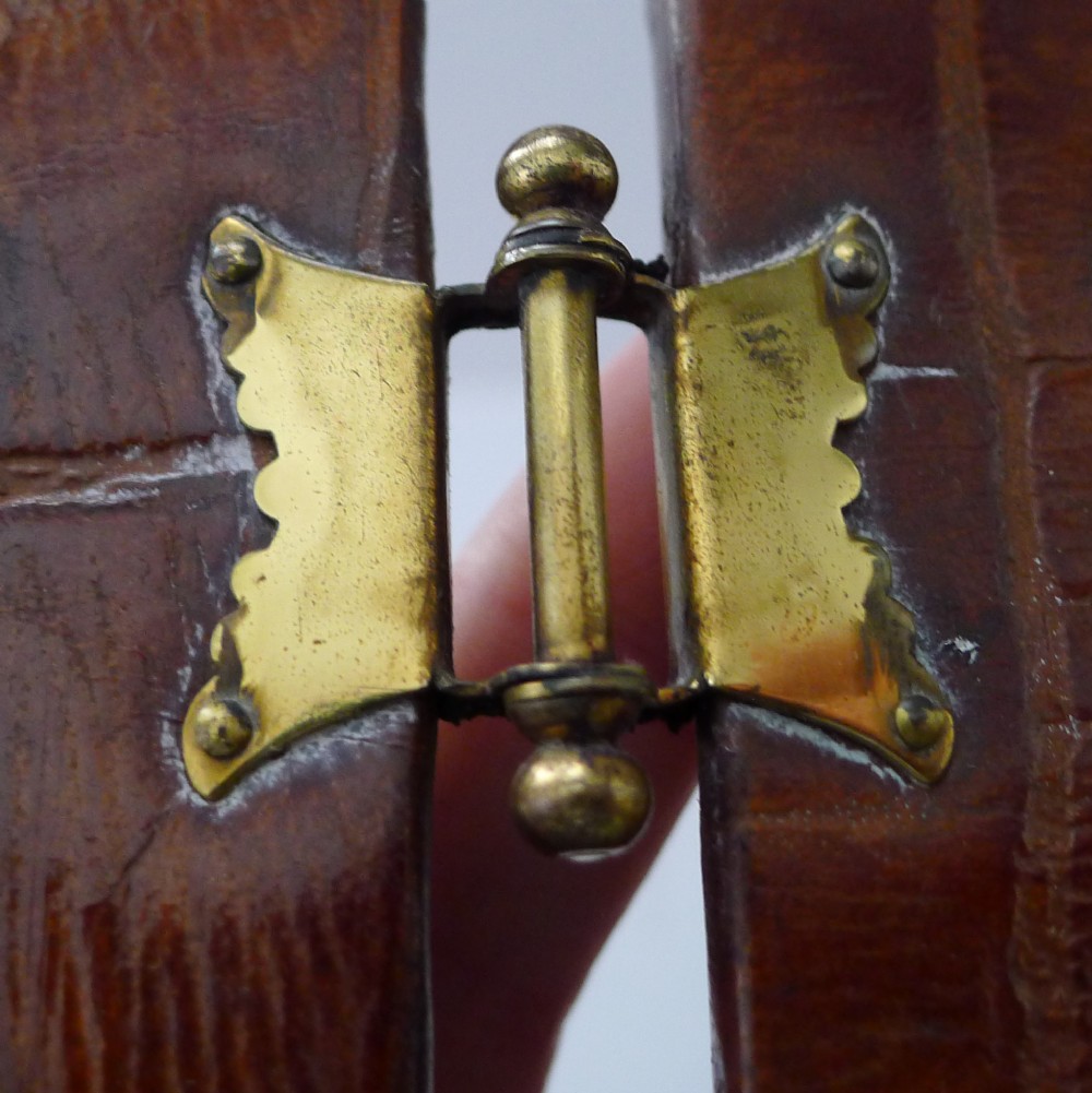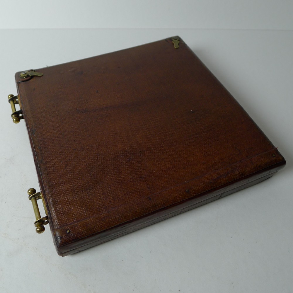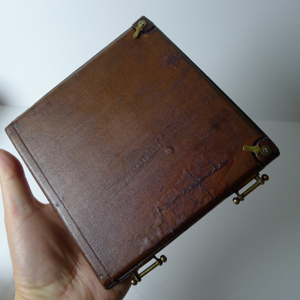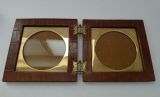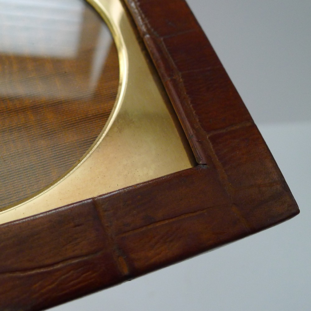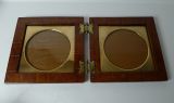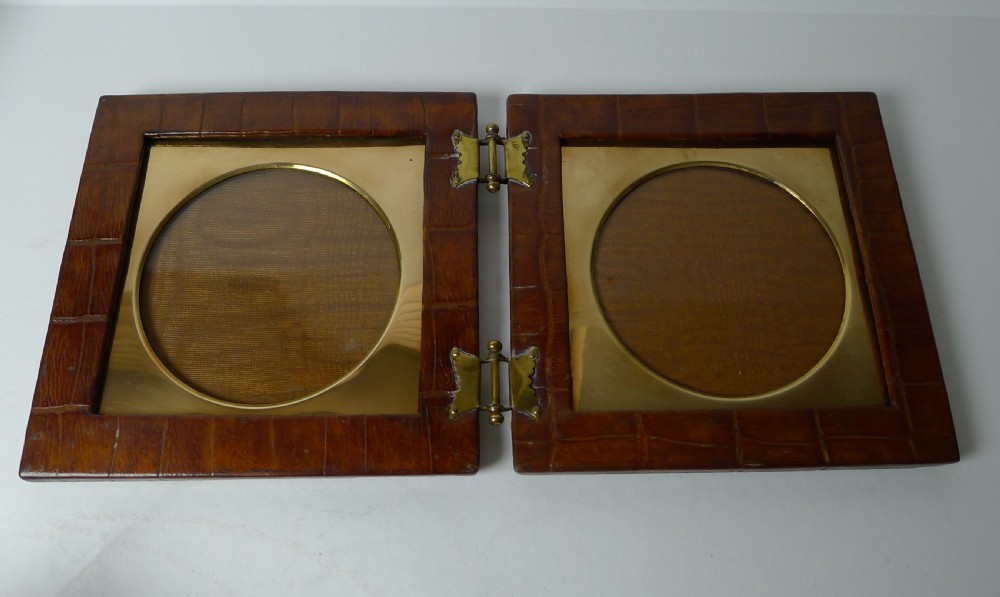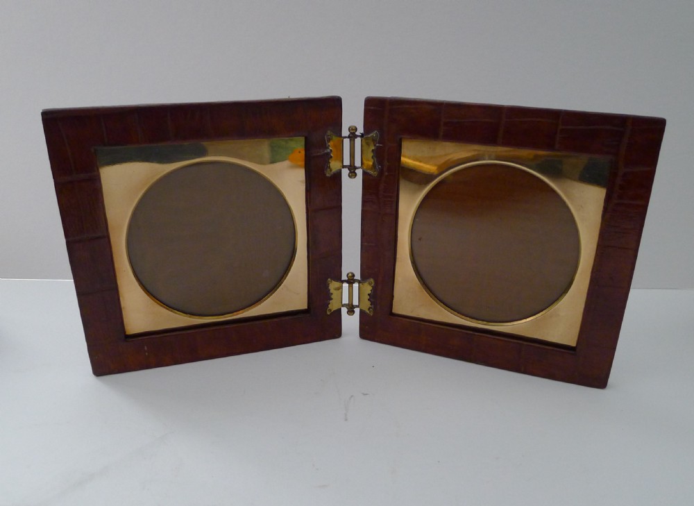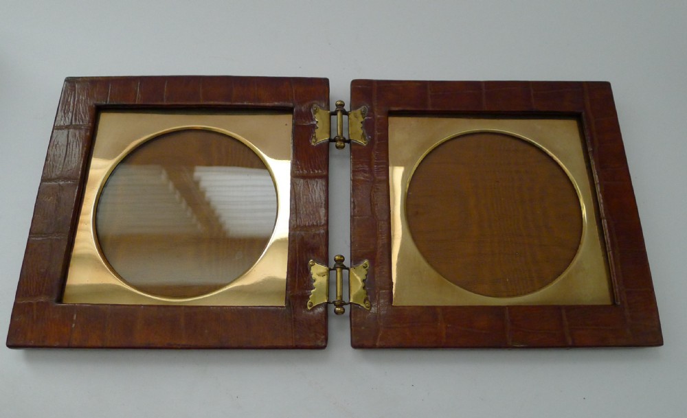 A very unusual and smart travel photograph frame dating to c.1910, late Edwardian in era and English in origin. The folding frame has brass matting cut in the centre with a glazed circular aperture. The back is covered in a linen fabric, some wear commensurate with age. Excellent condition measuring 12 1/2" x 6 1/4" while open with each aperture measuring 3 3/4" in diameter. When folded up it measures 6 5/8" including hinge x 6" x 1". Item: 43952 FREE Worldwide Registered Airmail Directly From the UK FREE Worldwide Shipping Directly From London, England Internal Ref: 43952